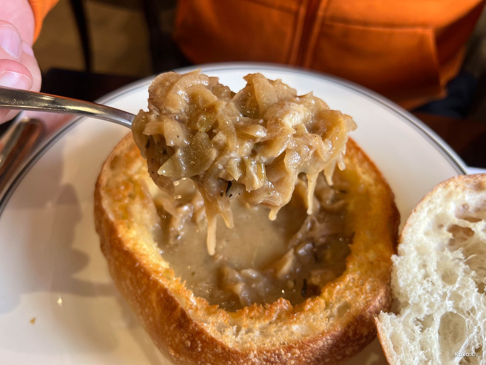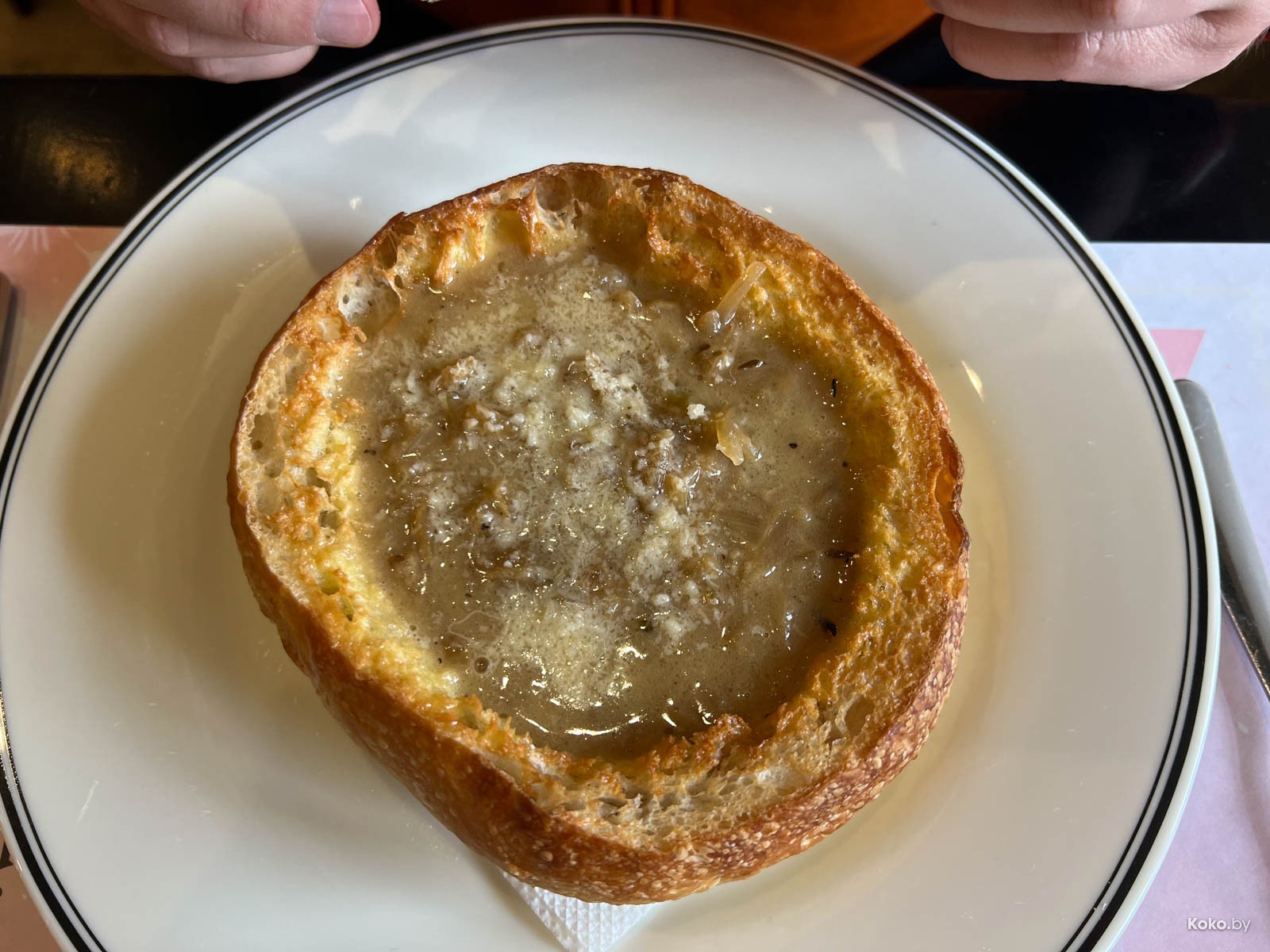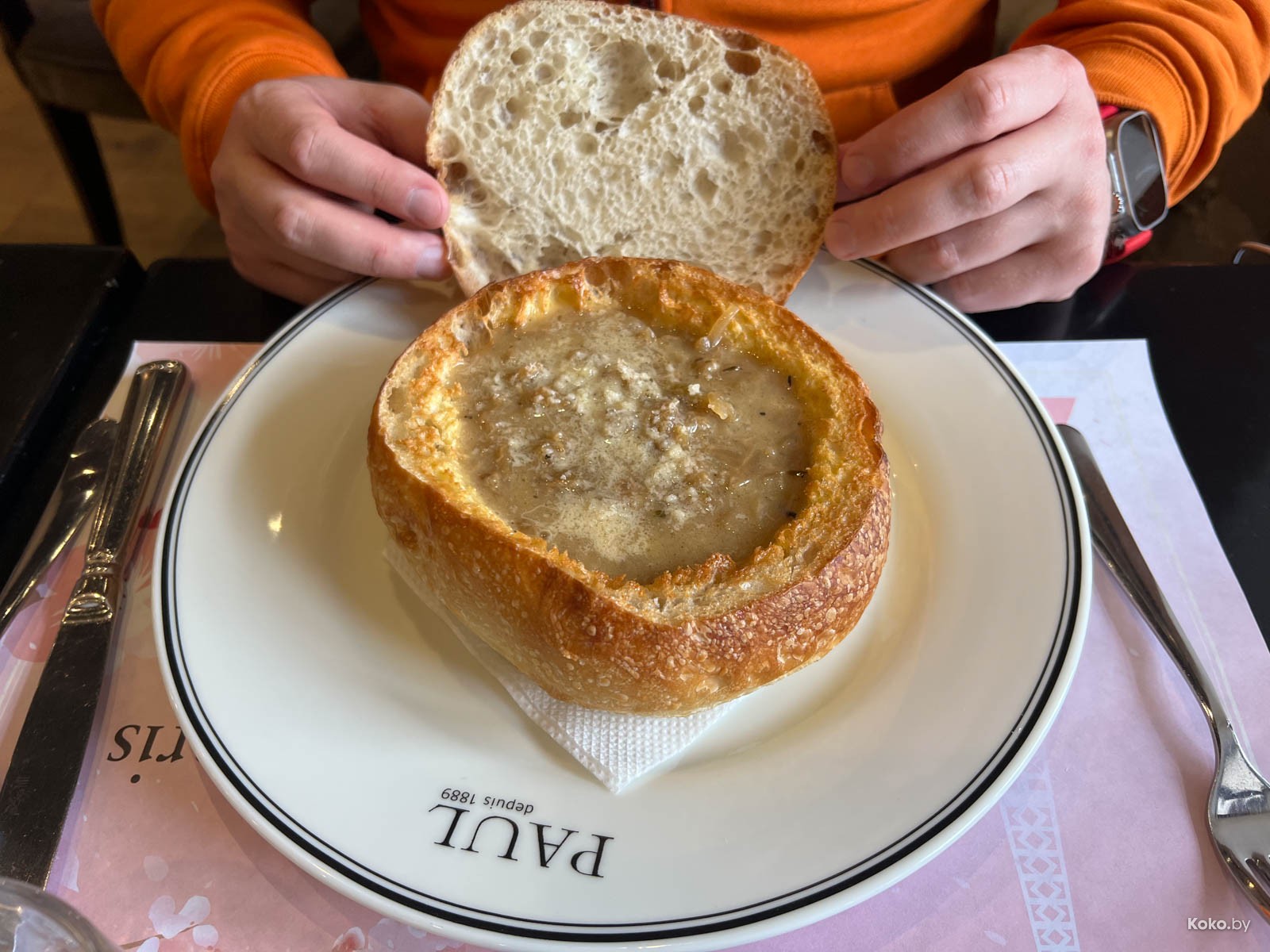 Французы настолько локализовались, что луковый суп за 14byn поместили в буханку своего хрустящего хлеба. Грех не догрызть шикарную булку, хоть с собой попроси завернуть. Тестил суп пару месяцев назад на Маркса, а фото прилепил из интернета.