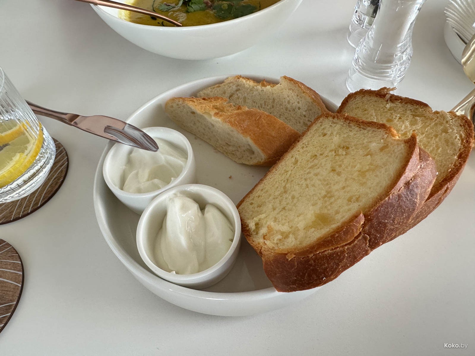 1. Первым получился стакан бесплатной воды и свой хлеб с греческим йогуртом. Хлеб вкусный, но почему не с маслом - известно только шефу.