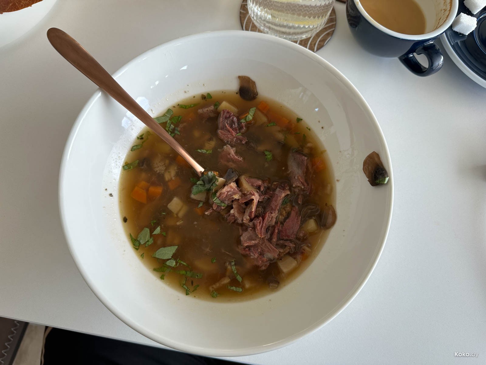 2. Бро выпал честных объёмов овощной суп с грибами по-деревенски за 14byn с каким-то мясом. Я бы его слегка посолил, по бульону збс, смачно!