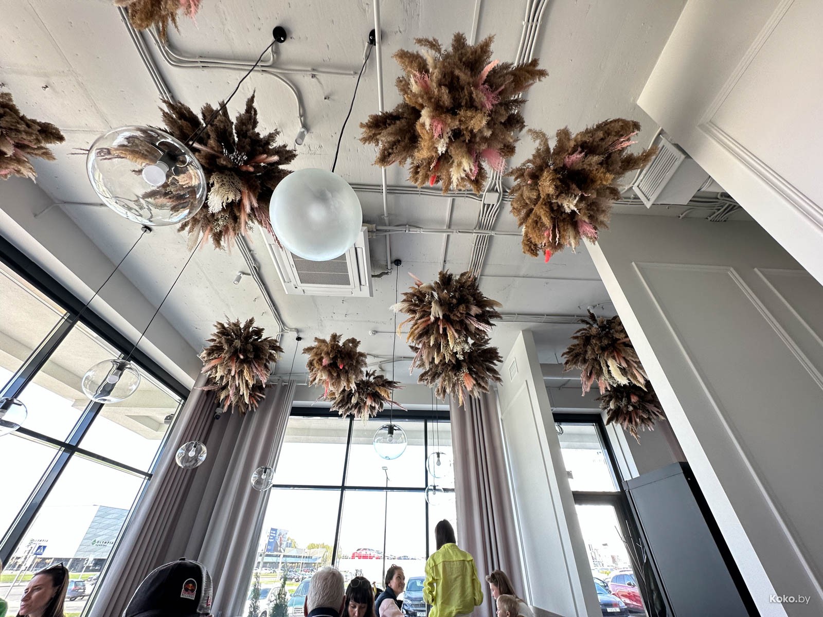 По атмосфере в бистро по-домашнему комфортно, светло за счёт стеклянных стен, под высокими потолками привязаны сухие веники, как в бане и «Именах». Из одиночного туалета доносится на все колонки музыка, что происходит? Столов много, посадка локоть в локоть, но как бы ненапряжно, это же бистро, быстро заказал - быстро поел.