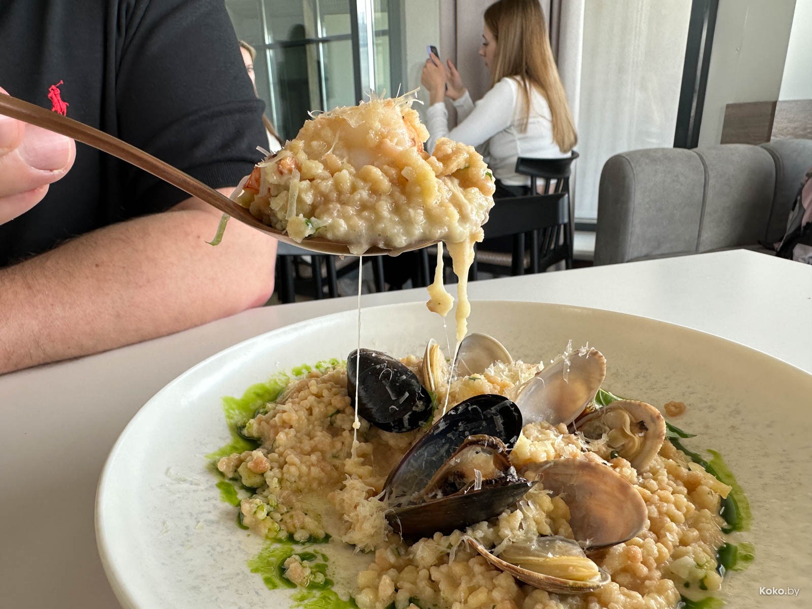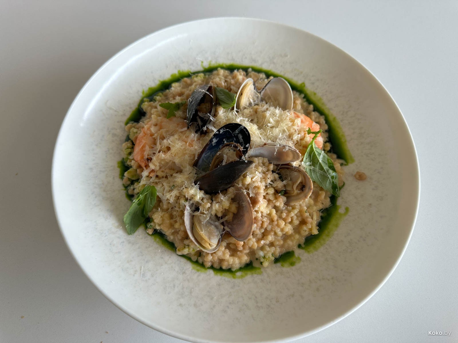5. Прошло около часа, вынесли пасту, с этого момента началась самодеятельность. Самодельная фрегола с морепродуктами за 26byn - это разновидность мелкой круглой пасты, напоминает орзо или птитим, только тут она жёсткая, местами недоваренная. По наполнению три больших хрустящих креветки, три вонголе и две мидии. Пойдёт, но вонголе пожалели, а они стоят три копейки, как и эта каша из макарон.