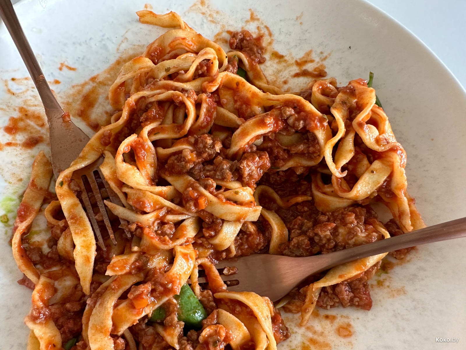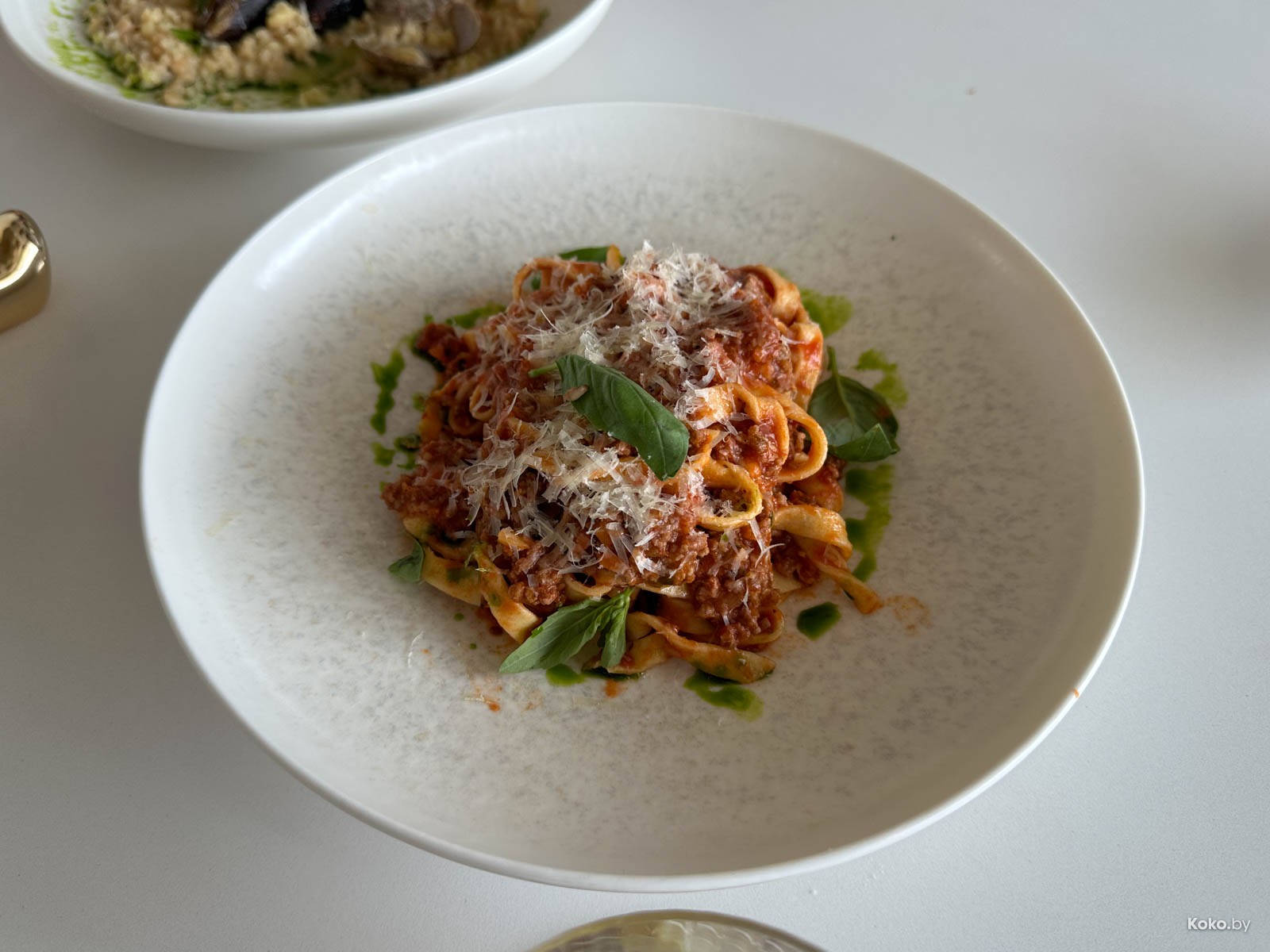 6. Самодельные фетучини в соусе Болоньезе за 18byn. Томатно-мясной соус идеально впитывается в рыхлую поверхность макарон, порция средняя, приготовлено вкусно, как дома один в один. Молодцы!