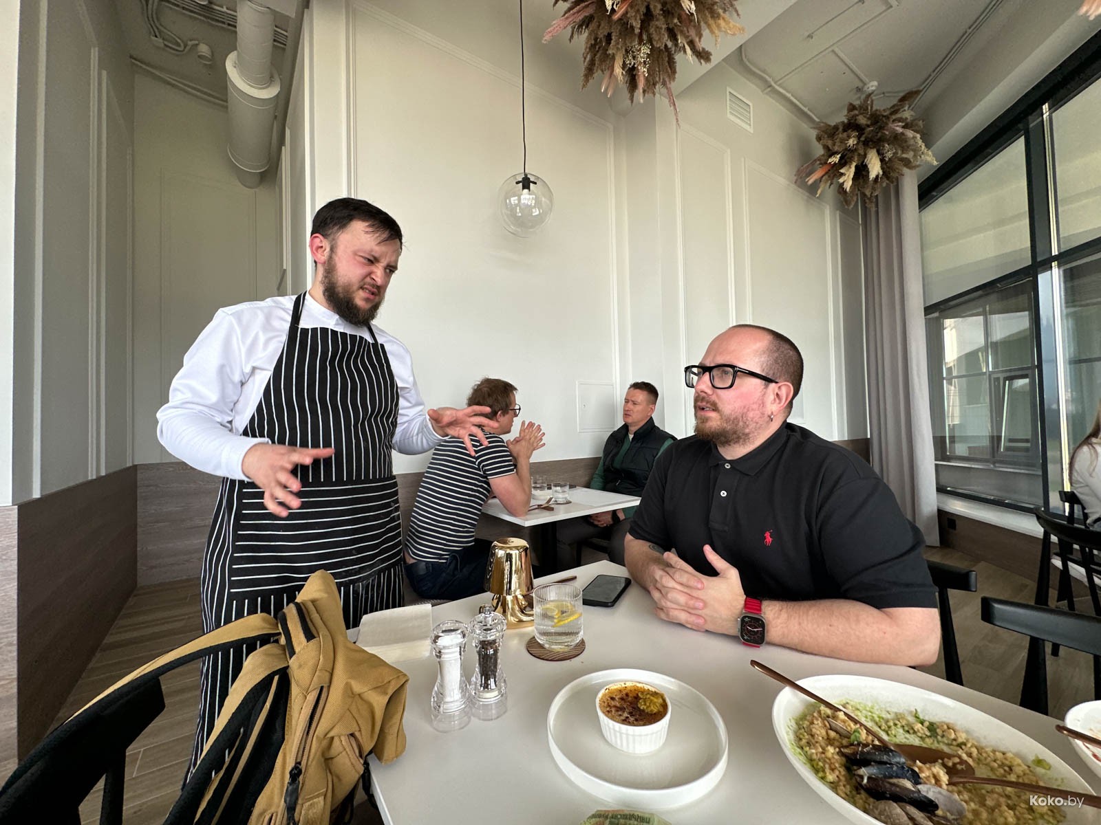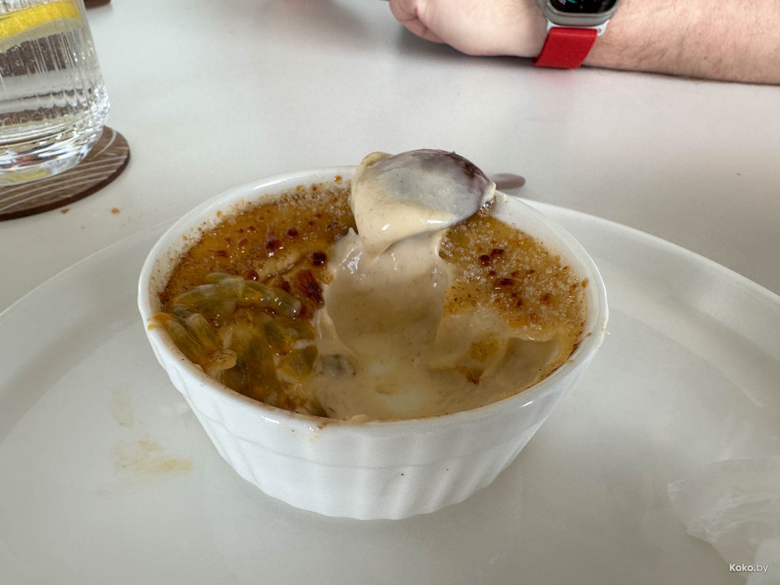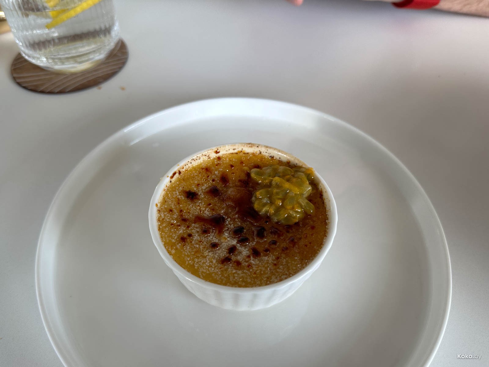 7. Под занавес шеф-повар отлучился с кухни, принеся в жертву тыквенный крем-брюле за 10byn. Сахарная корочка не стеклянная, внутри холодный. Тестовое открытие, нервничают, бывает со всеми.