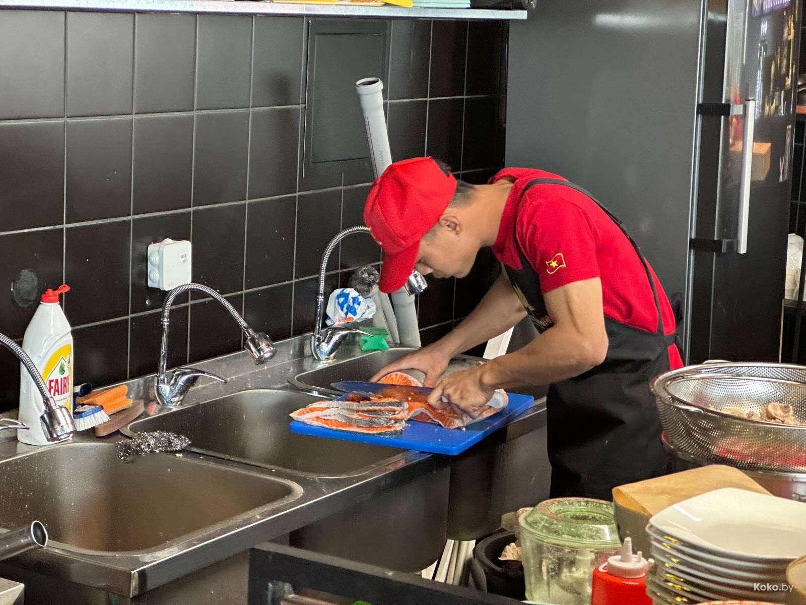 В гигантских кастрюлях из нержавейки наваривается говяжий бульон, а обеденная тушка форели экономно нарезается на шницели.