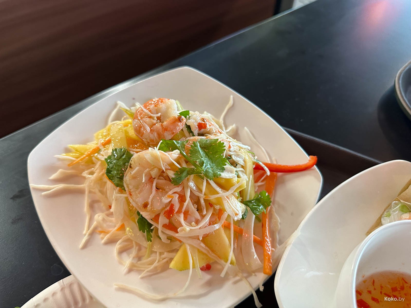2. Салат с тремя креветками размером с детский палец, не самым спелым, но сладким манго и капустой под кисло-сладкой заправкой, стоит 15byn. Заправка решает, вкусно, но порция - хоть ты хлеб проси.