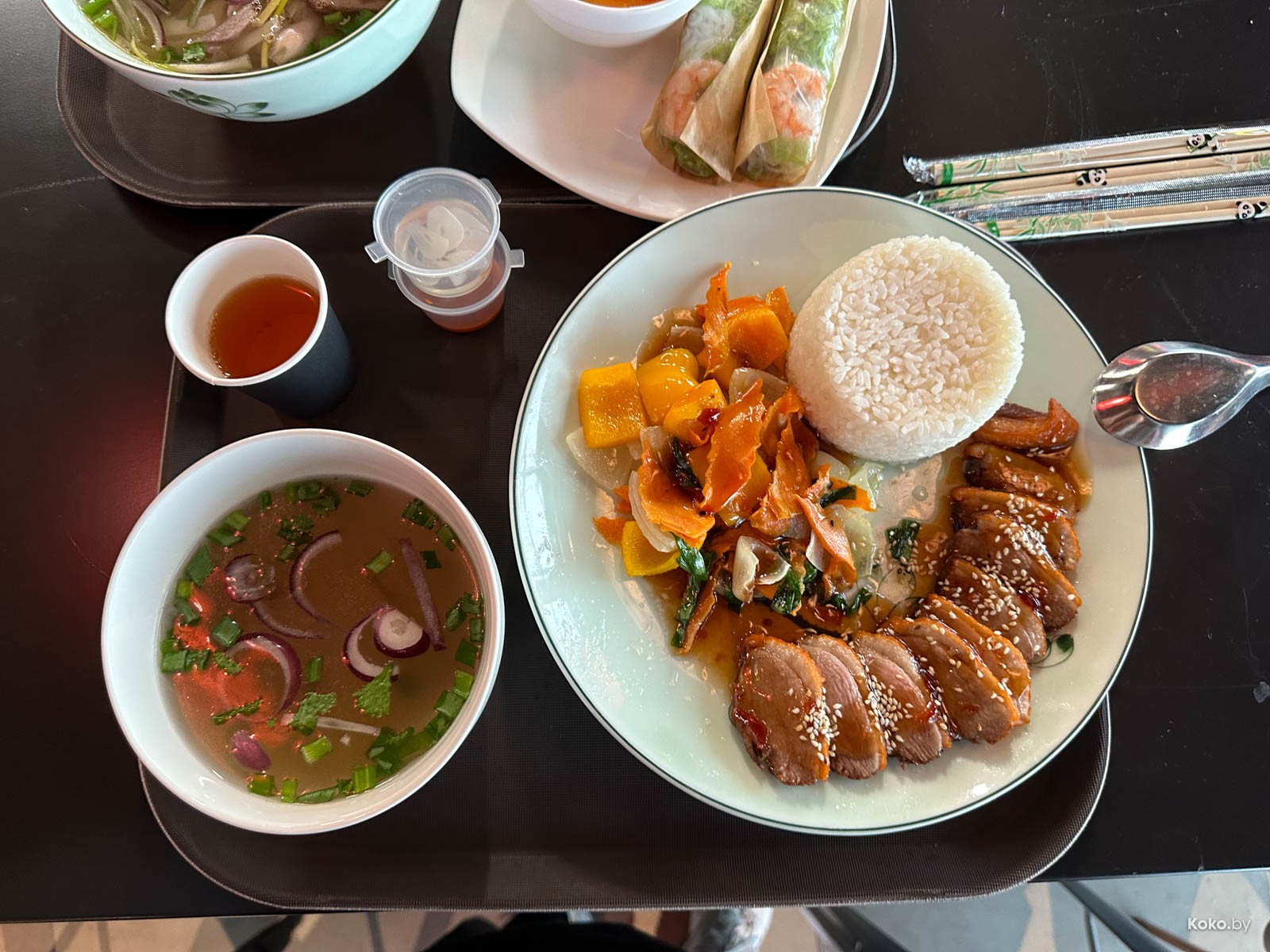 Комбо-обед от 15byn за рис с тофу до 20byn за утку или креветки. В сет входит пиалка говяжего бульона из Фо, салат и стопарик зелёного чая.