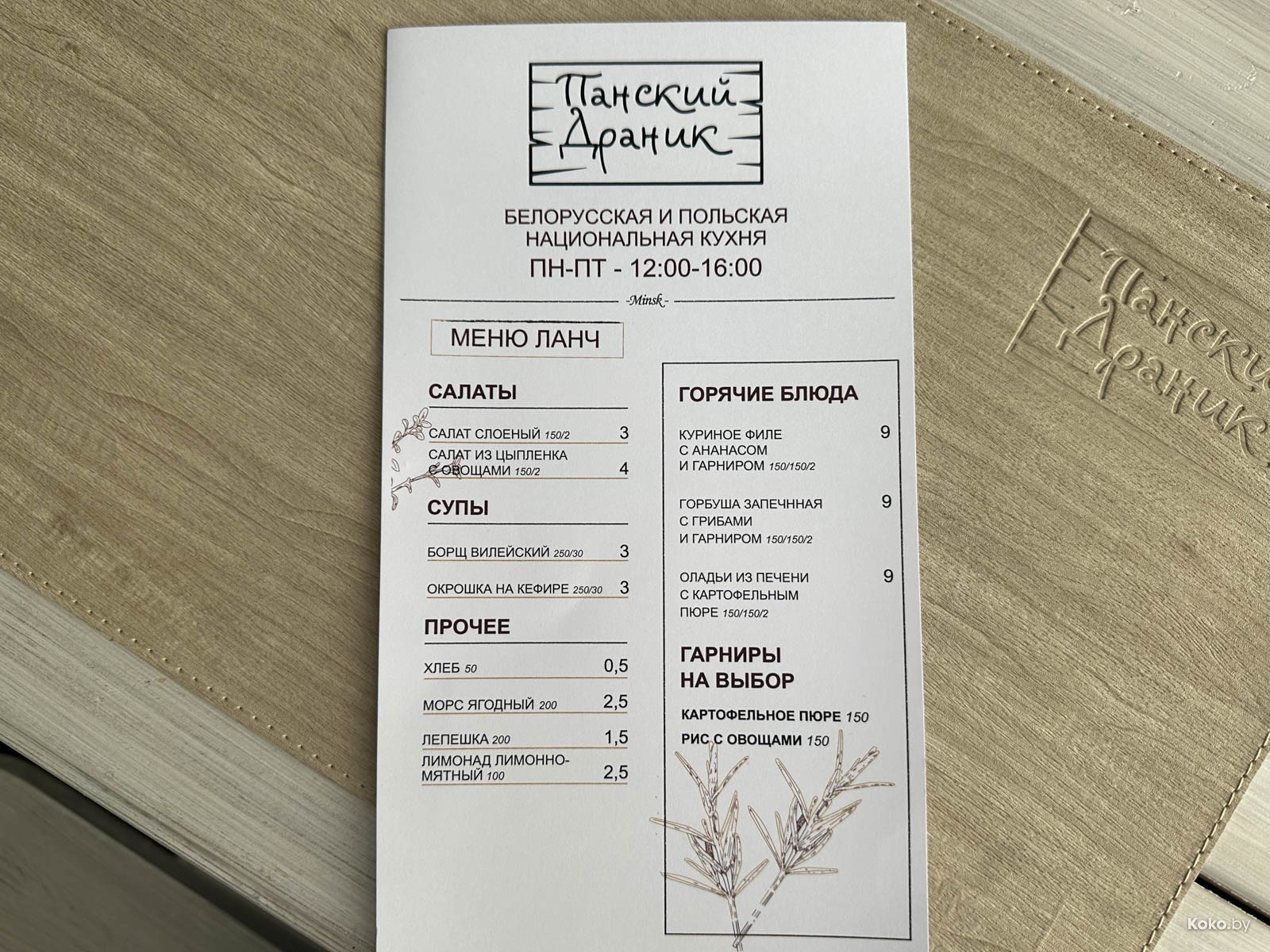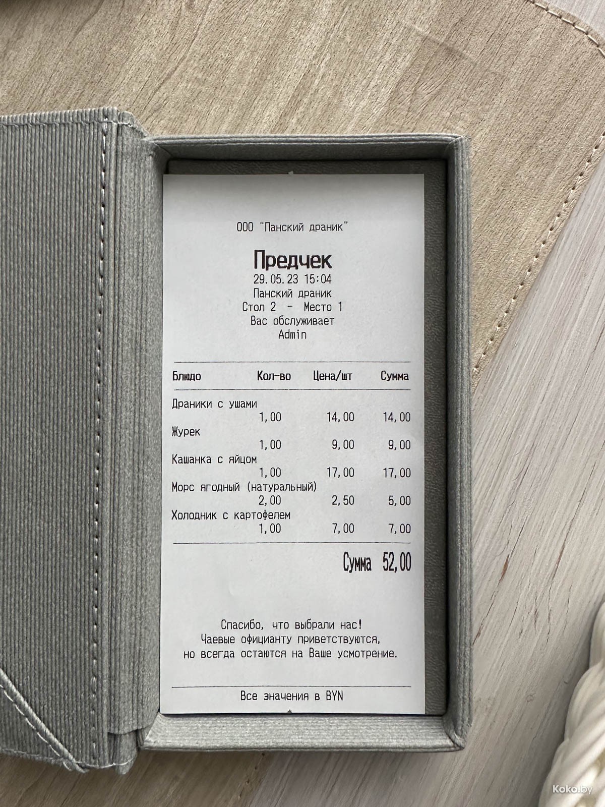 Это их второе заведение про белорусские и чутка польские рецепты, первое найдёте в подвале на Раковской, где отработало легендарное кафе «Талака». Формат кафе домашний, с большими порциями понятной еды, если говорить за драники, когда не хочется в попсовые «Васильки», а в «Бульбашах» хочется, но в копилку колется. Только со сковороды «Панский Драник» занял место, китайского дома чего-то там на Володарской, за легендарной «Чебуречной».