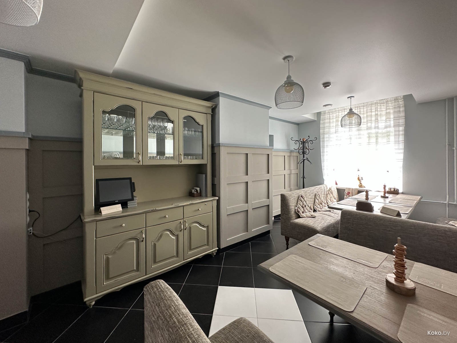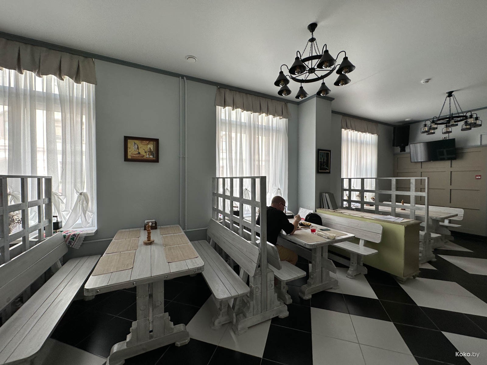 Внутри простой ремонт с элементами белорусского этноса, на столах подставки с бесплатными сушками, выглядит слегка кринжово. Но, как наставляли наши деды: дарёному коню в зубы не смотрят. Помещение большое, на подоконниках выставлены угольные утюги.
