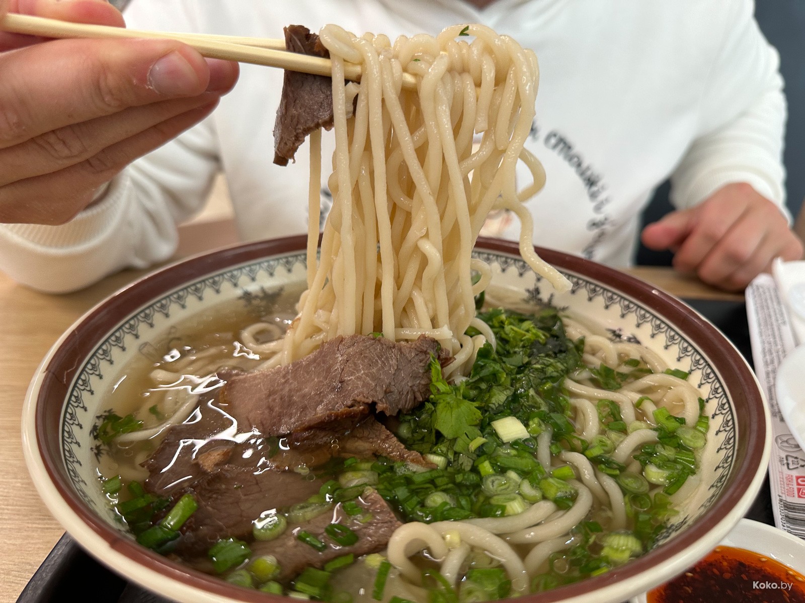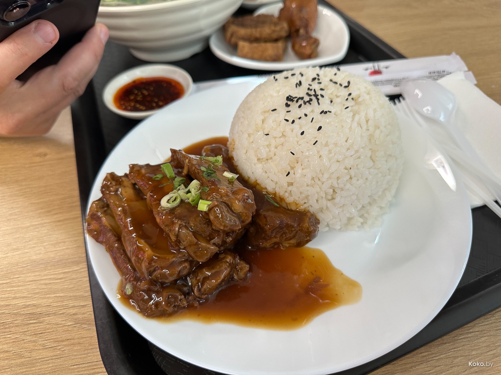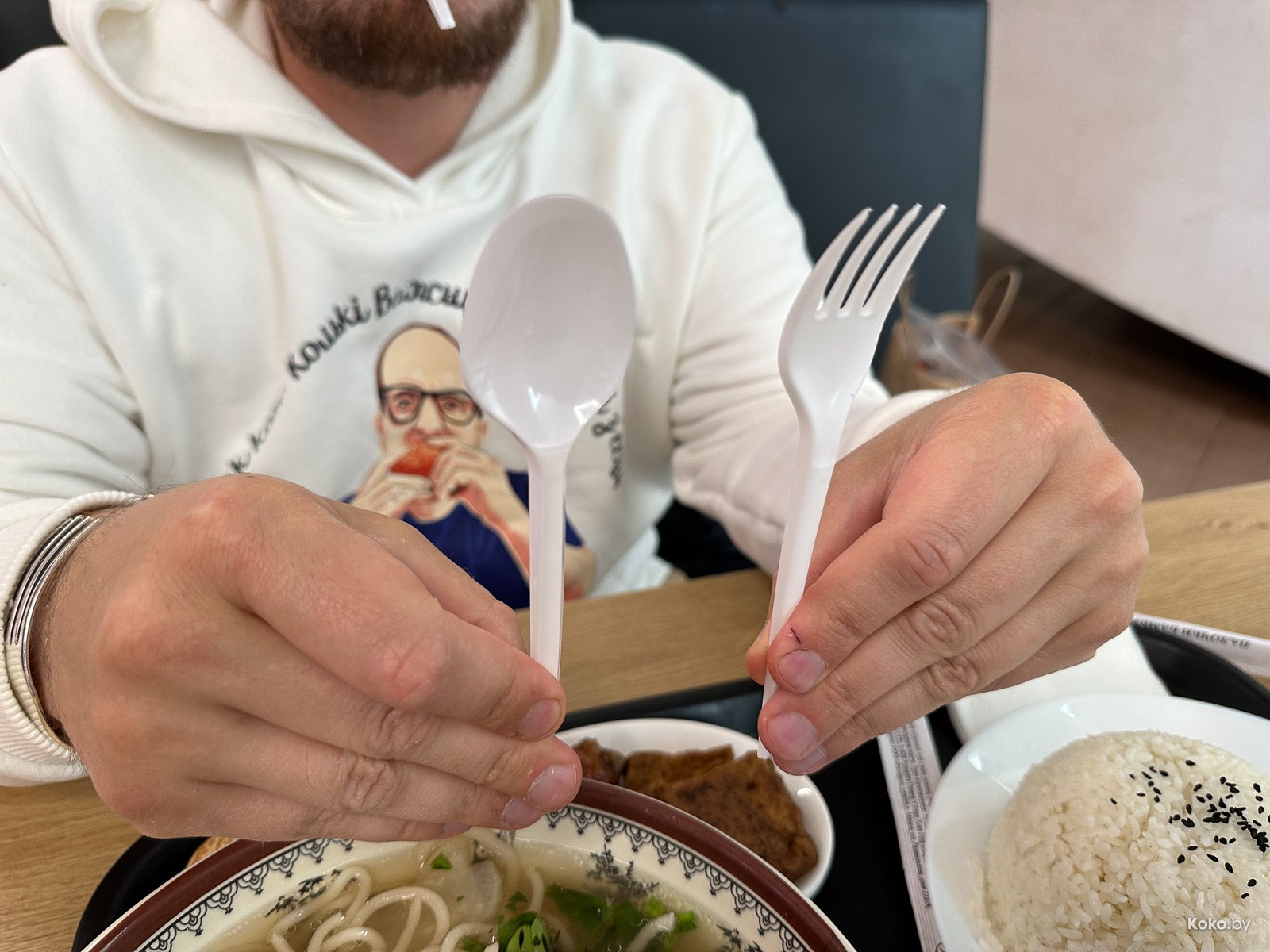 1. Пейджер зазвенел минут через десять, в руки мне выдали поднос еды на двоих за 33byn. Пиала говяжьего бульона за 12byn с мясом и своей упругой лапшой сильно напоминает рецепты «Шису» на «Конкорсе».