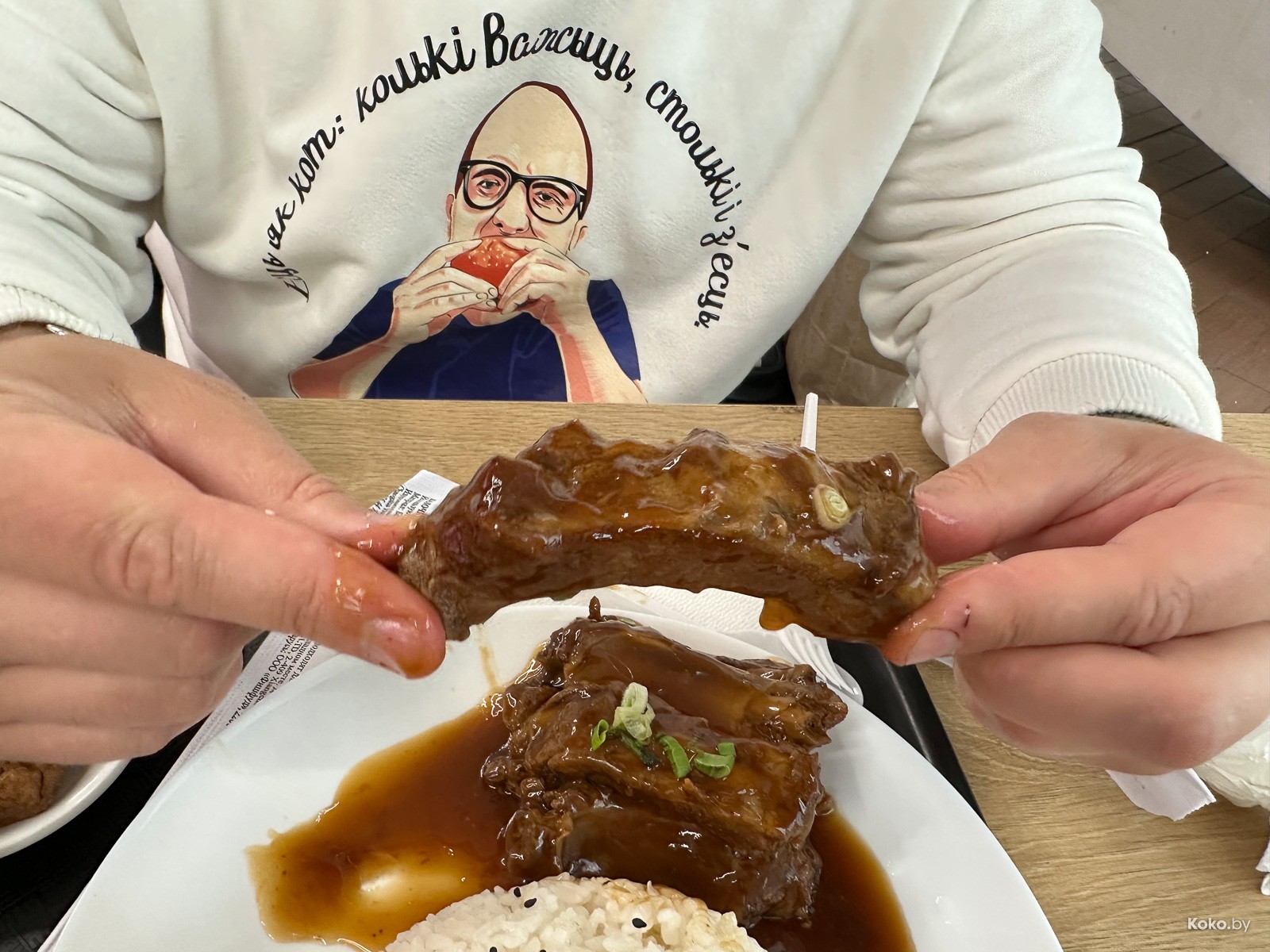 3. Мне досталось погрызть тушёные тонкие свиные рёбрышки за 14byn, в, скорей всего, соевом соусе. На гарнир пачка отваренного риса.