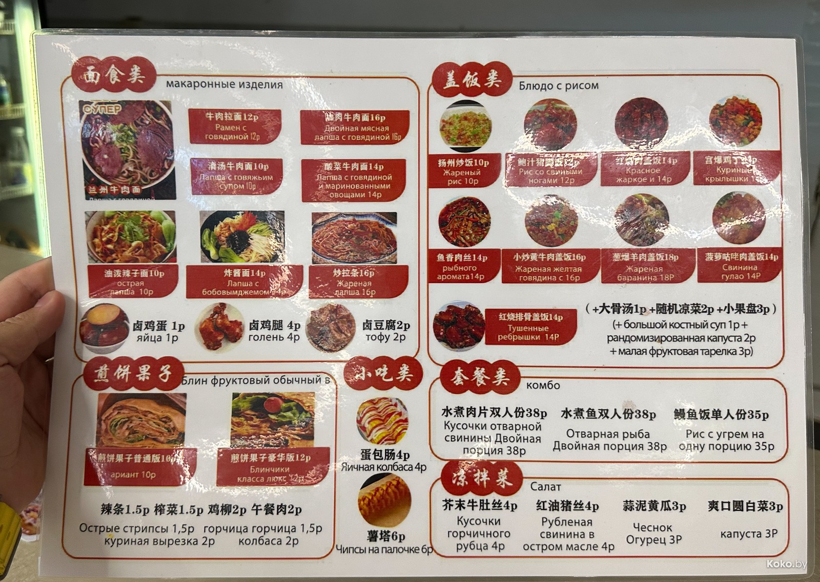 Меню состоит из супов, жареной лапши и всякого мяса с горой риса, цены приятные, с учётом того, что у китайцев всегда большие порции.