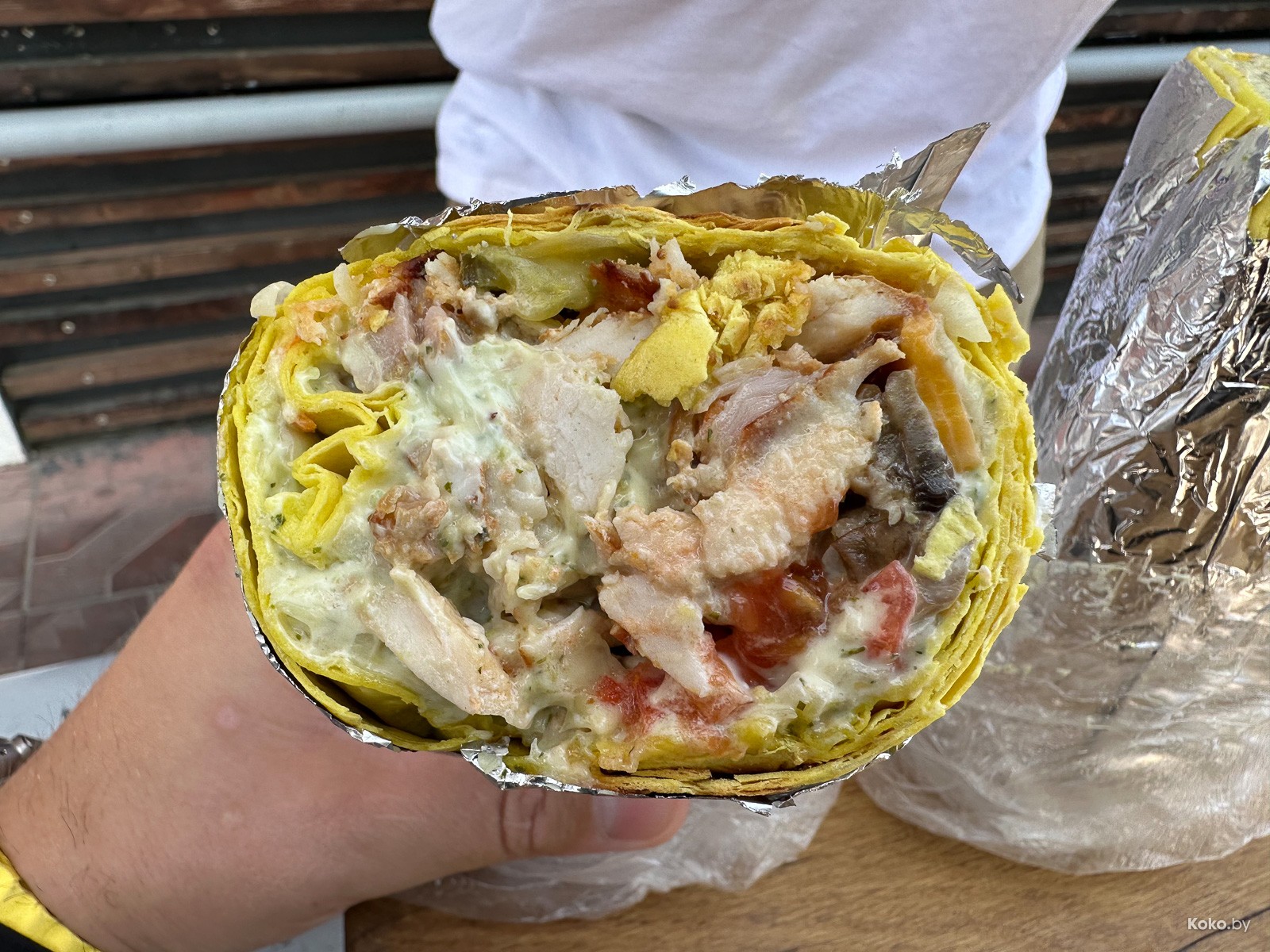 После третьего укуса стало ясно, что тонкий лаваш пересушили, он стал буквально разваливаться на глазах. Палка кебаба на 70% состоит из куриного мяса и на 20% из соуса. Самодельный чесночный зелёный соус, возможно на кефире, прёт из каждой щели, так быть не должно.