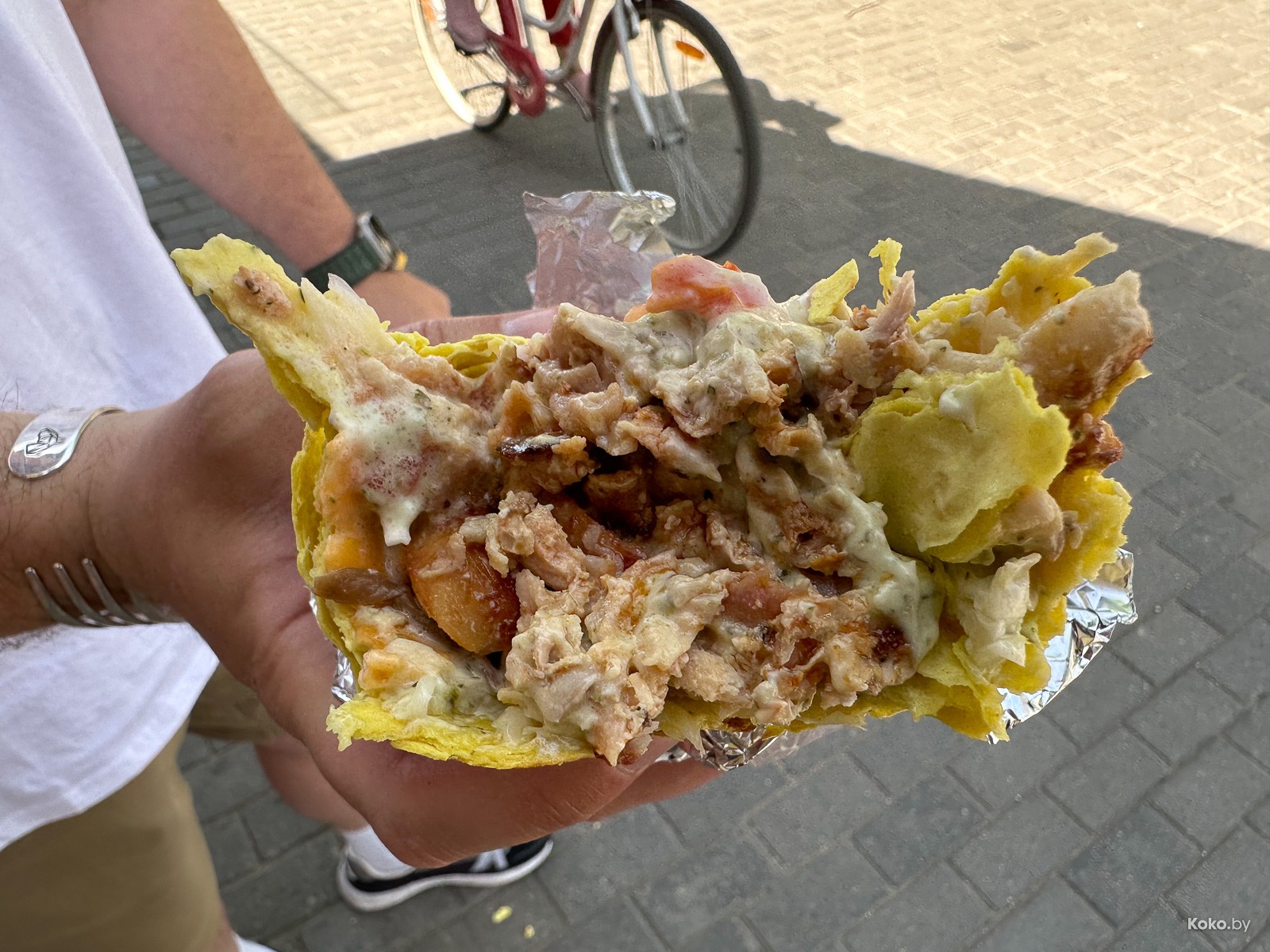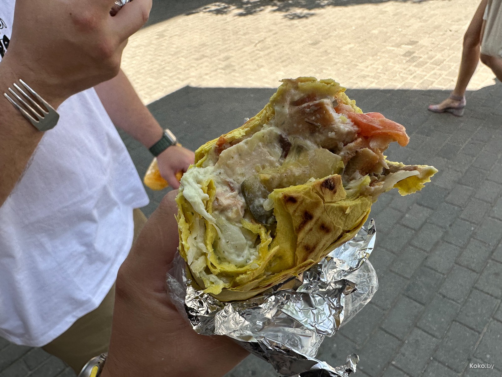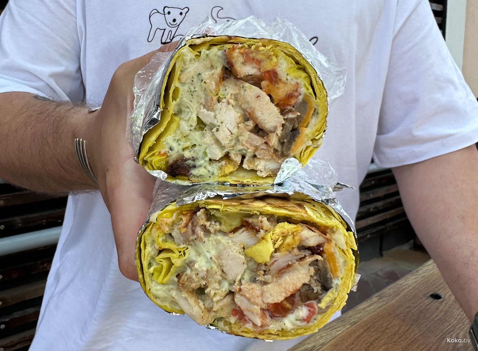 Курица сочная, её от души, овощей в меру, огурчик солёный в тему, пожалуй, в сморгонской шаурме случился идеальный баланс!