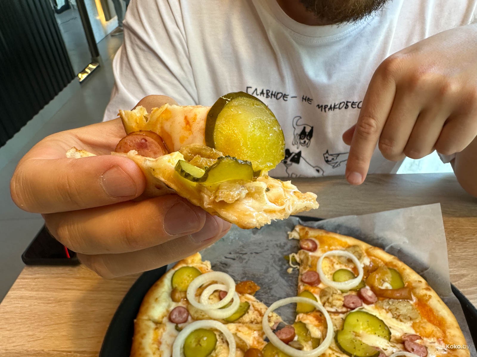Тесто прям как в «Пингвине» - мягкое, воздушное, слегка тянется. На нём два вида колбасок, но мало, опята из банки, маринованный лук, маринованные огурчики, чуть сыра, и забыли томатную пасту.