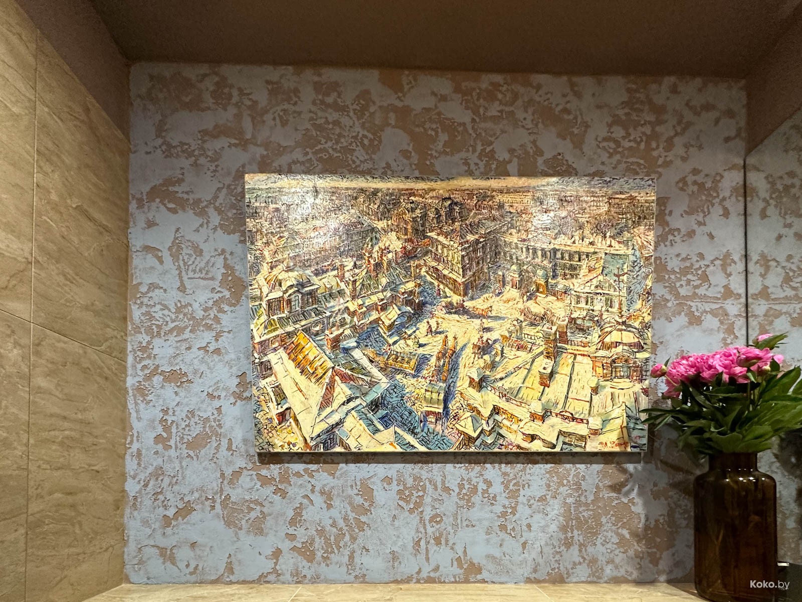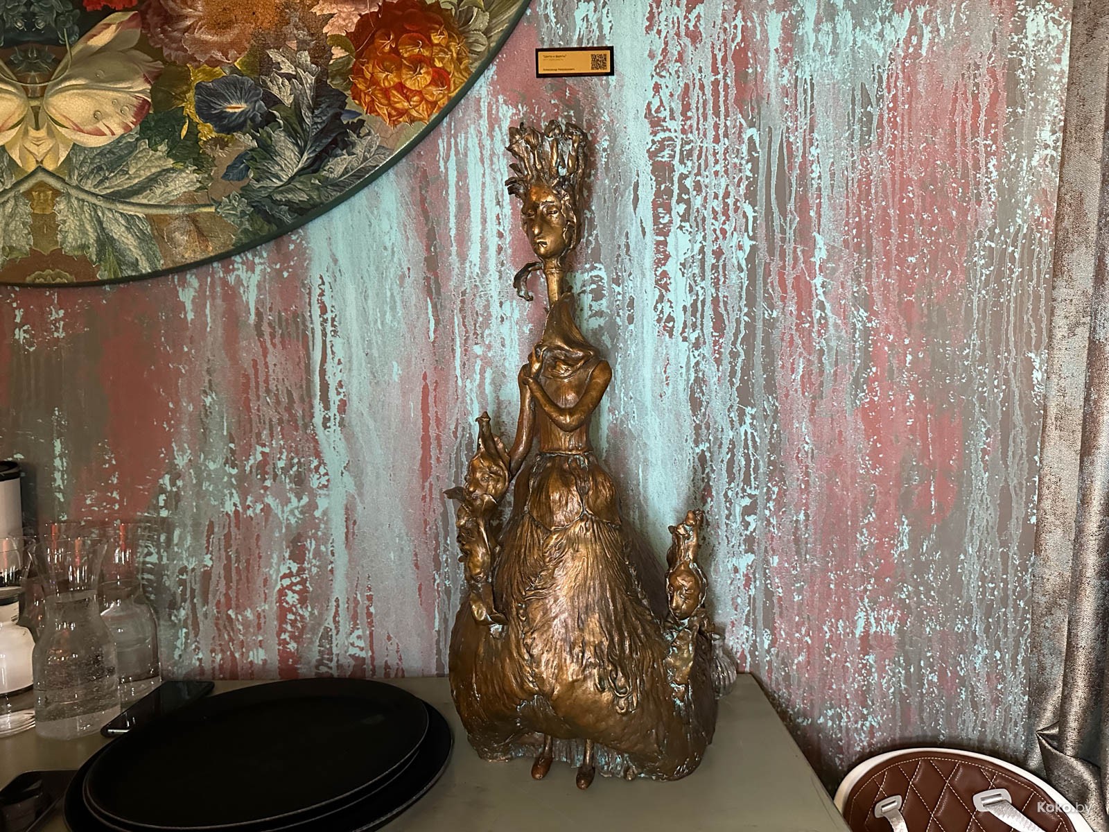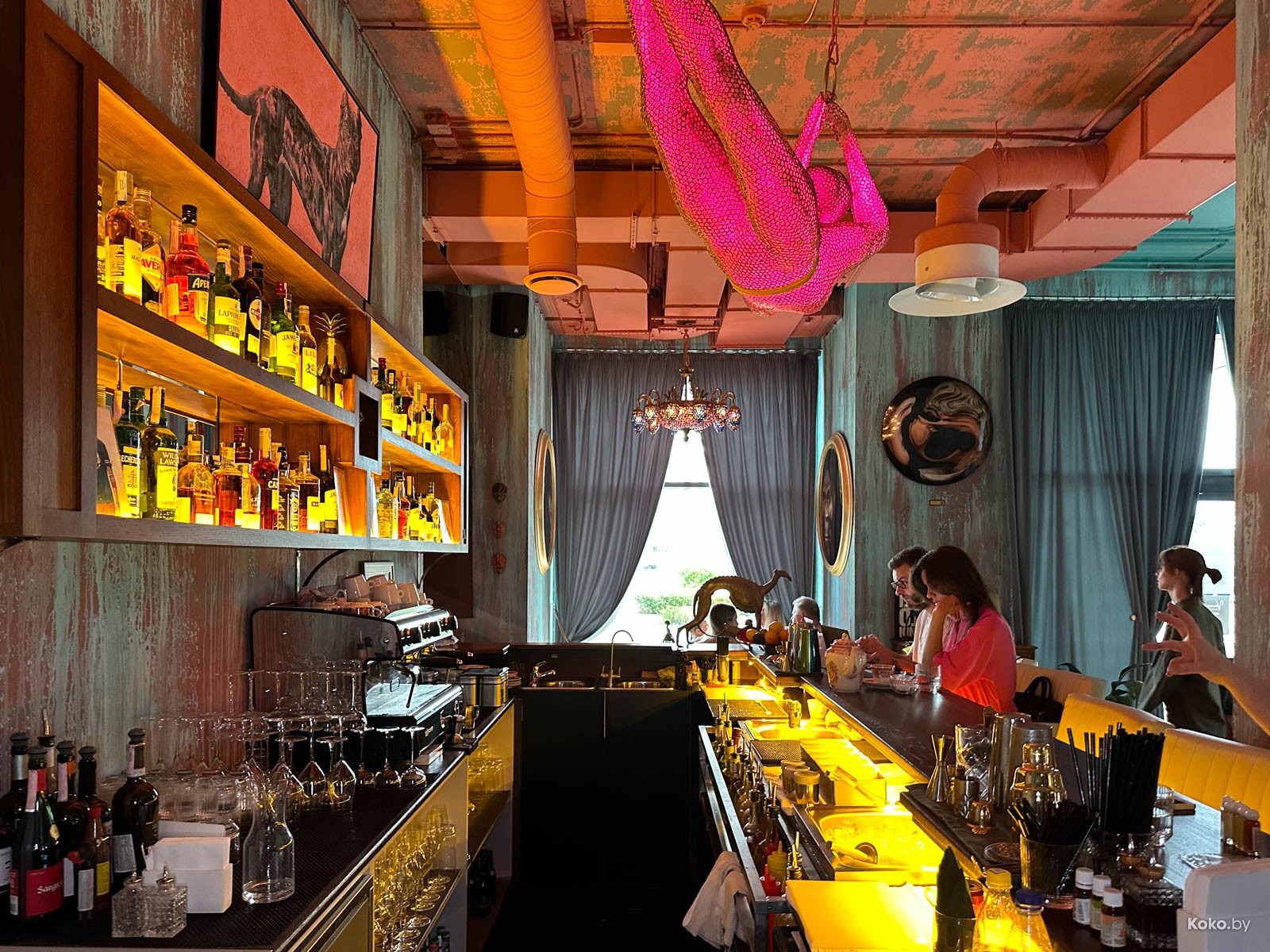 Внутри помещения с большими окнами порядка семи столов плюс барная стойка, особо не разгуляешься, но комфортно. По атмосфере напоминает частную антикварную лавку. Десятки картин наших художников, медные статуэтки, изумительные по красоте лампы, большая картина с питбулем в полный рост. Над баром растянута женщина, благо не живая. Как в музее, только накатить можно.