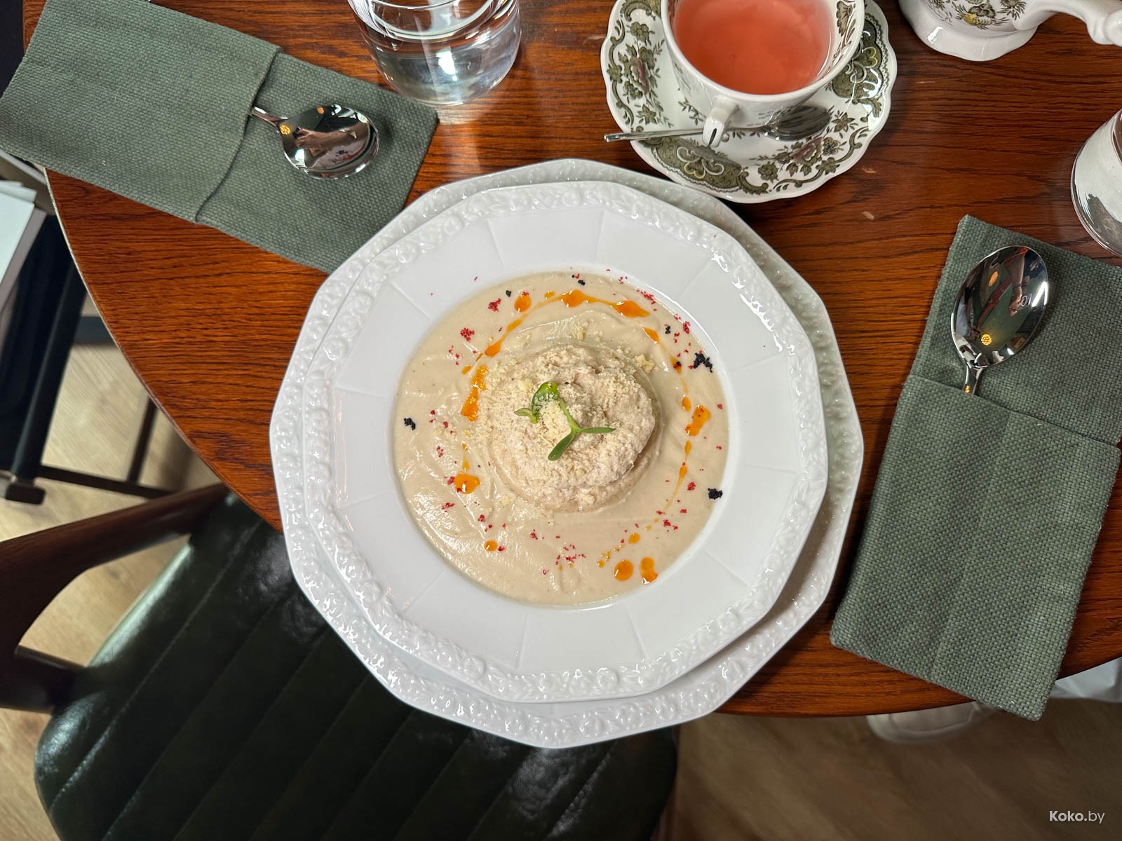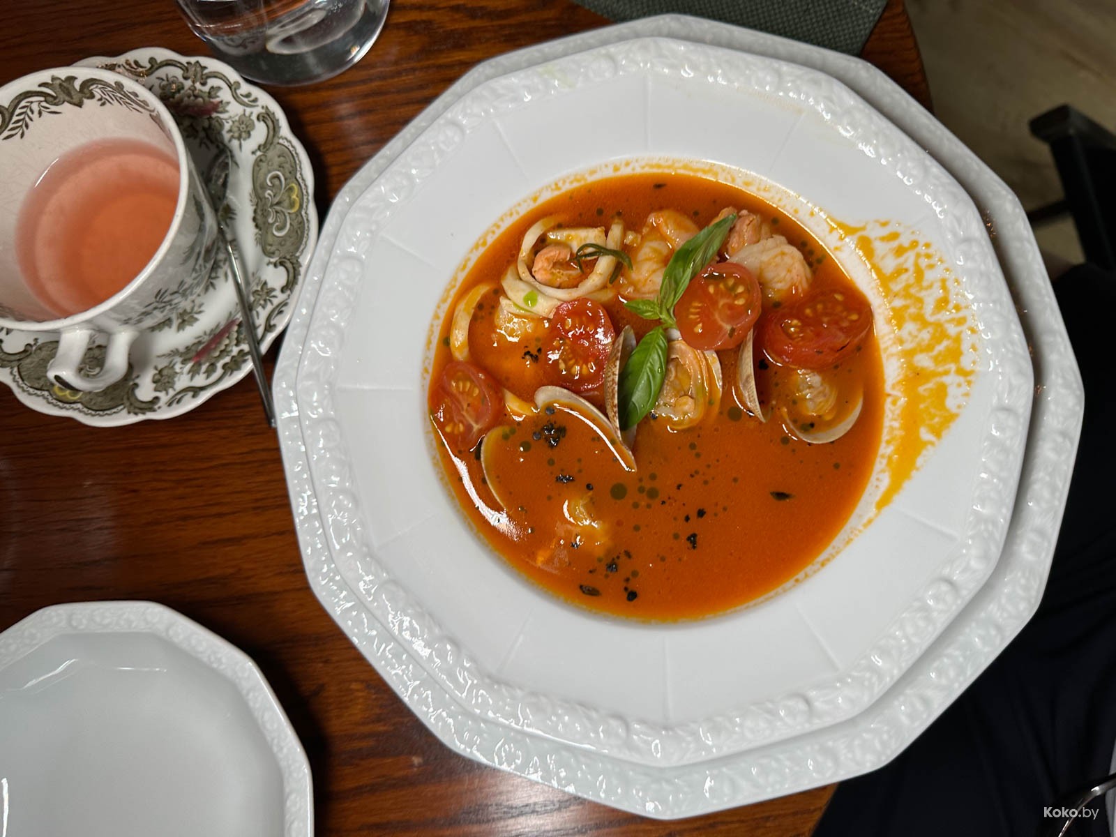 1. Посадка полная, надежд быстро поесть не питаю. Первым делом на столе оказались все три супа, два превращены в пюре большими порциями по 18byn, и один рыбный биск пару ложек за 24byn. В нём насыщенный рыбный бульон со скромным наполнением мориками.