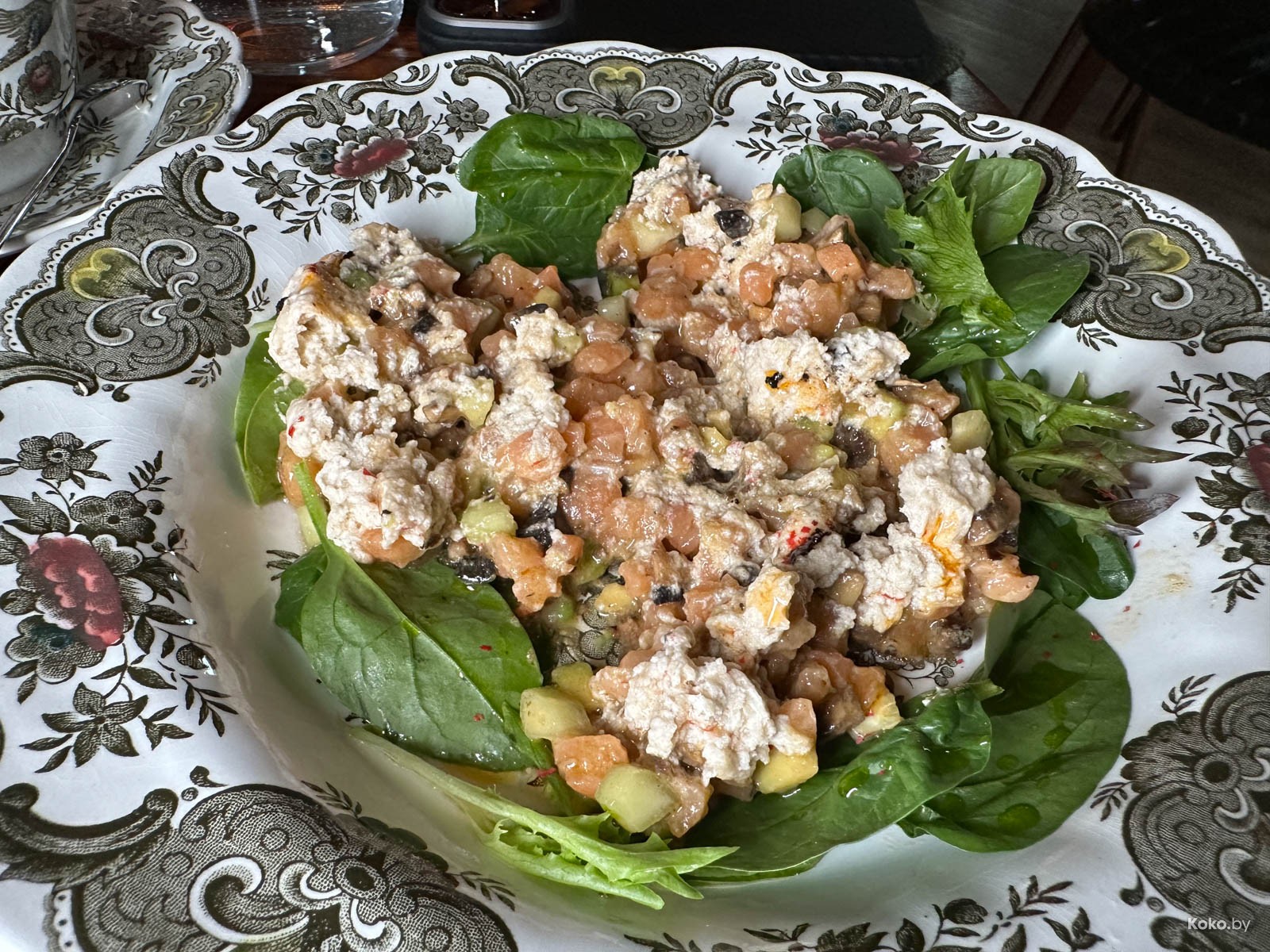 3. В окружении шпината замес бледного лосося кубиками с огурцами под грибным муссом - 26byn. Просто необычное сочетание, пойдёт.