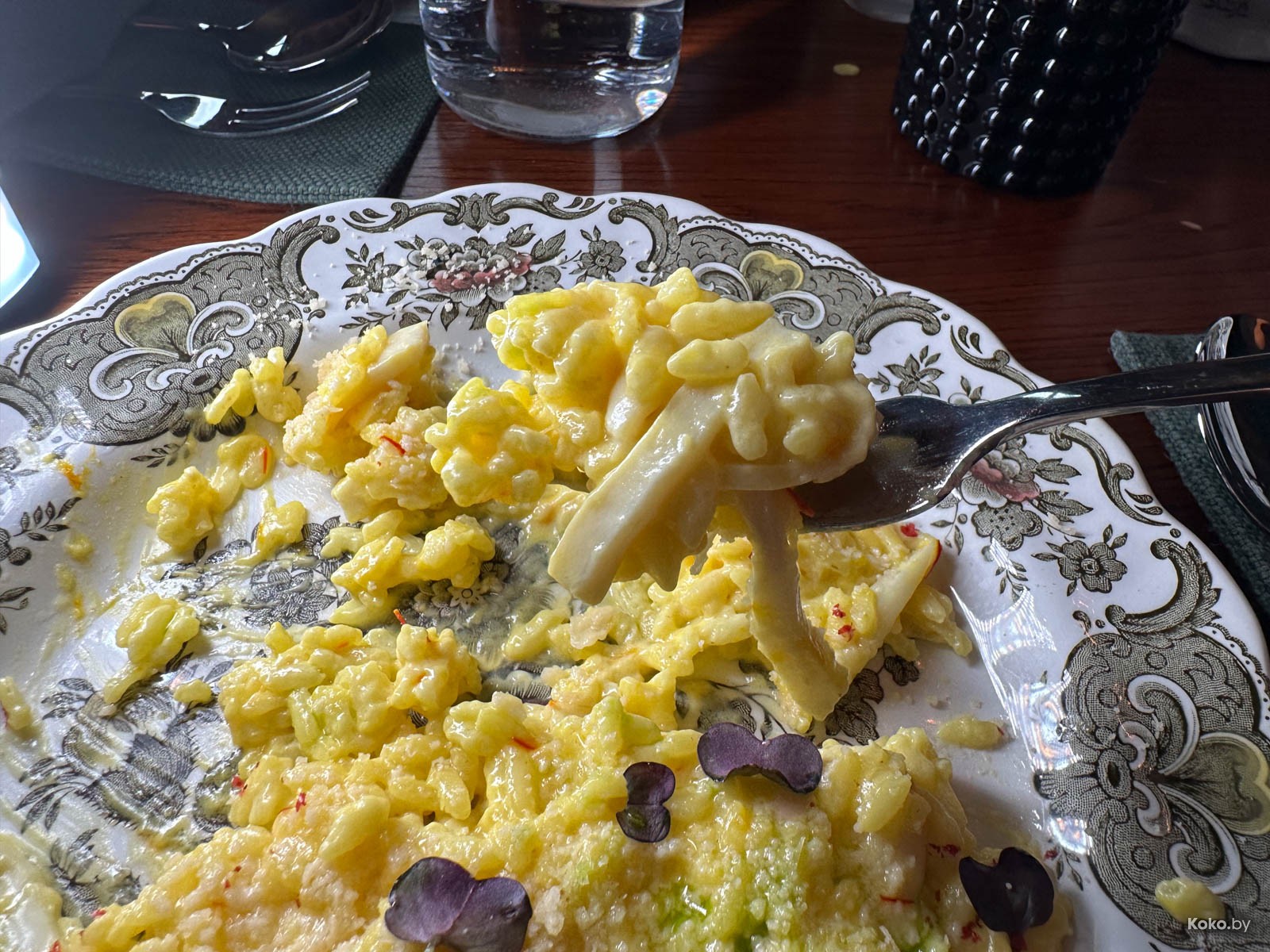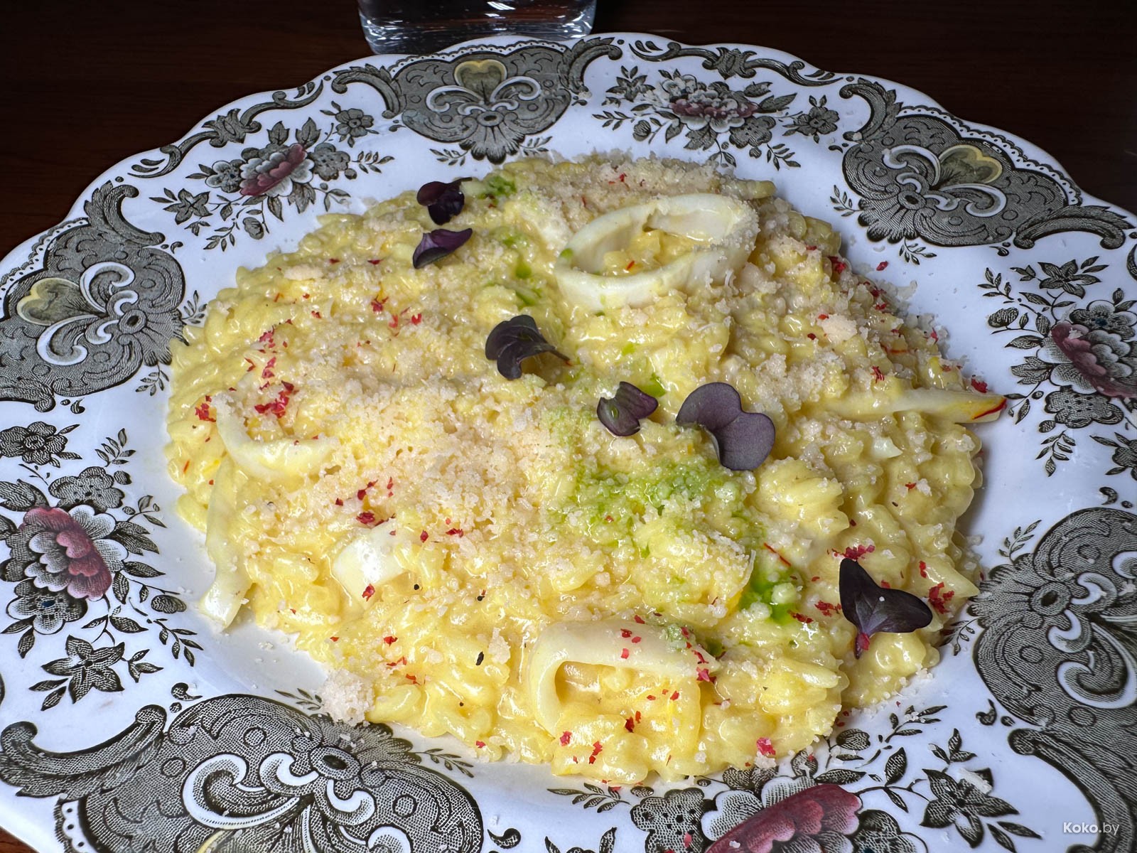 4. Ризотто Брит-мила с кольцами кальмара и шафраном под крошкой из Пармезана за 27byn. Шучу-шучу, не надо гуглить название, текстура кремовая - не супом, ризотто удалось. Вкусно наелся с одной тарелки.