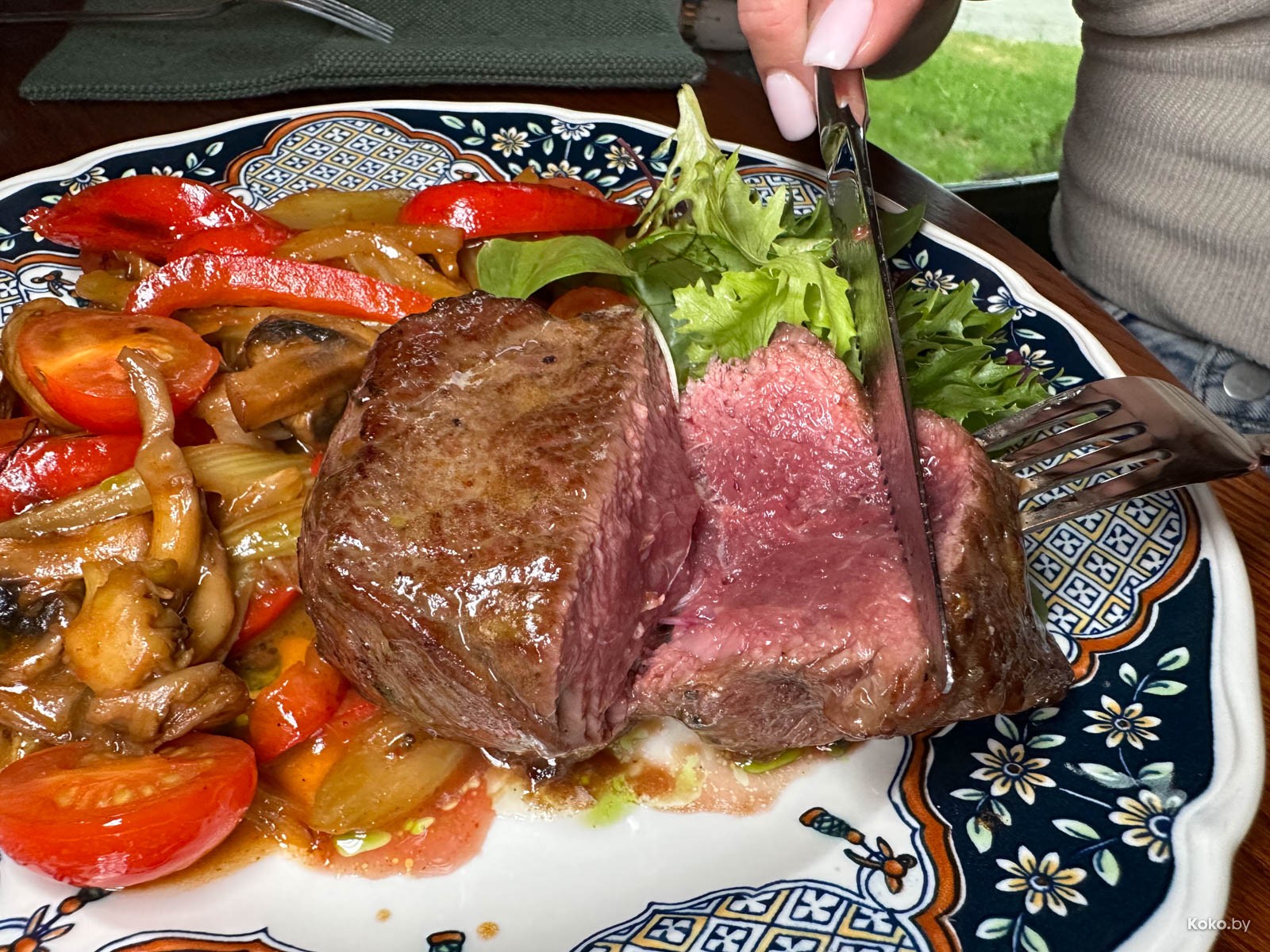5. За 39byn кусок говядины бон-филе, как в «Чайном Пьянице», с рагу из овощей и двумя видами грибов. В медиум рэ попали, мясо сочное, легко режется, можно даже не жевать - годно. Глотать, как утка, не стоит.