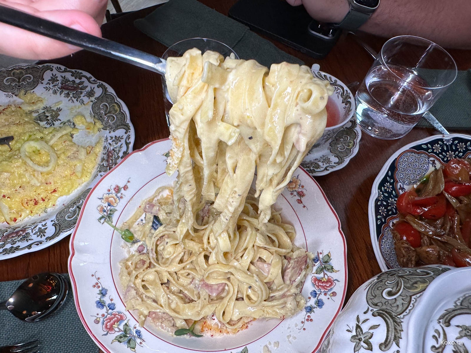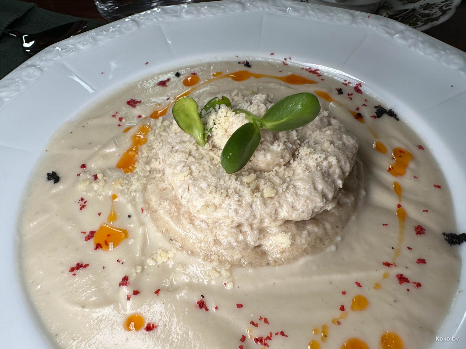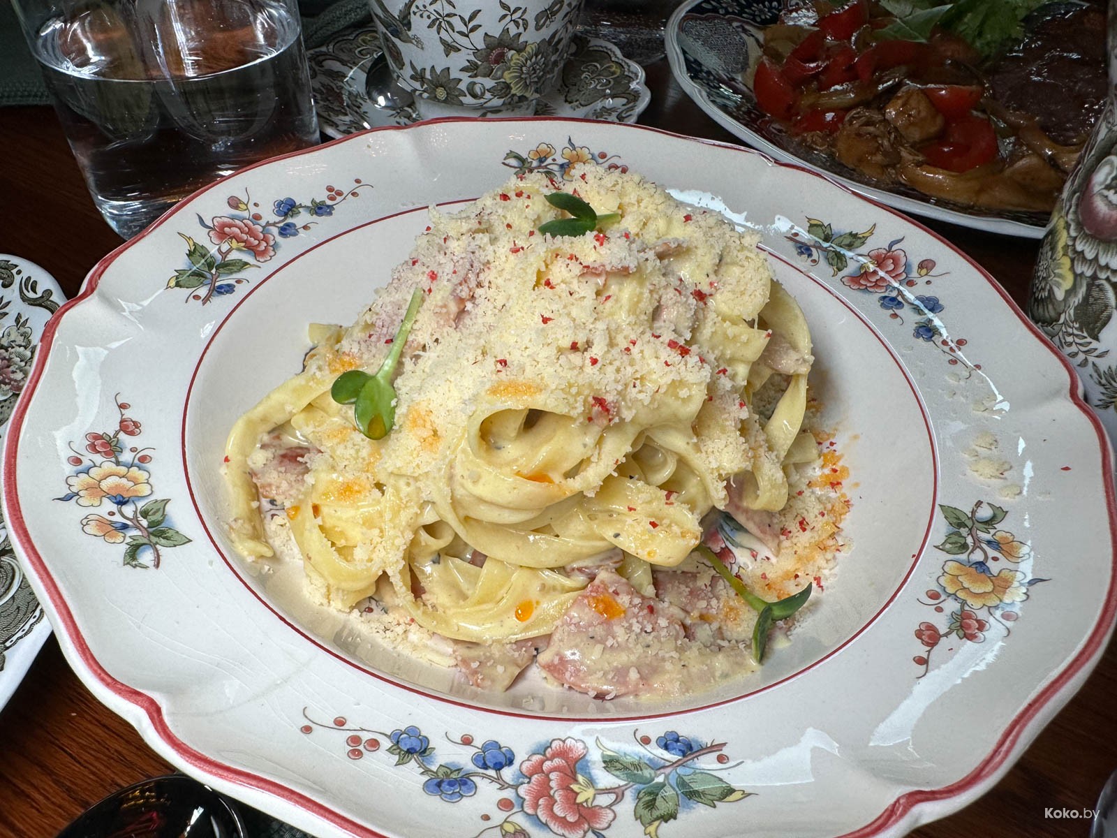 6. Если у них Карбонара всегда чуть помещается в тарелку, то на десерт вас не хватит. Фетучини ровно аль денте под пылью пармезана в жёлтом соусе из желтков и с жареной попкой поросёнка. Топ за 24byn.