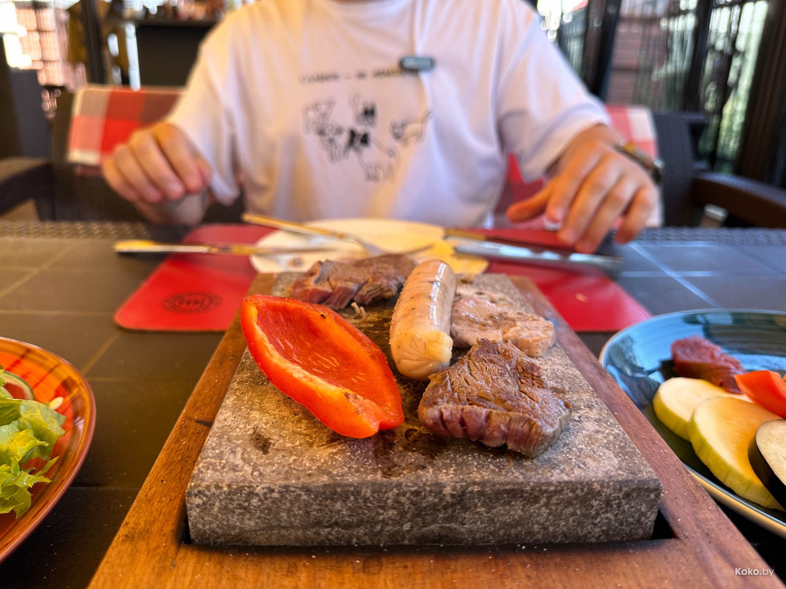 На раскалённом, посыпанном мелкой солью камне, тонко нарезанное мясо жарится мгновенно. Добротный кусок говяжьей вырезки, сосиски «Галерея Вкуса» и постная жопка свиньи не заставили себя долго ждать.