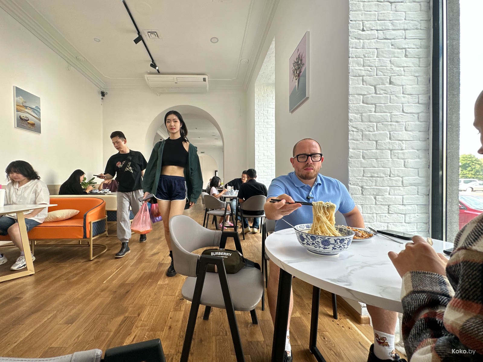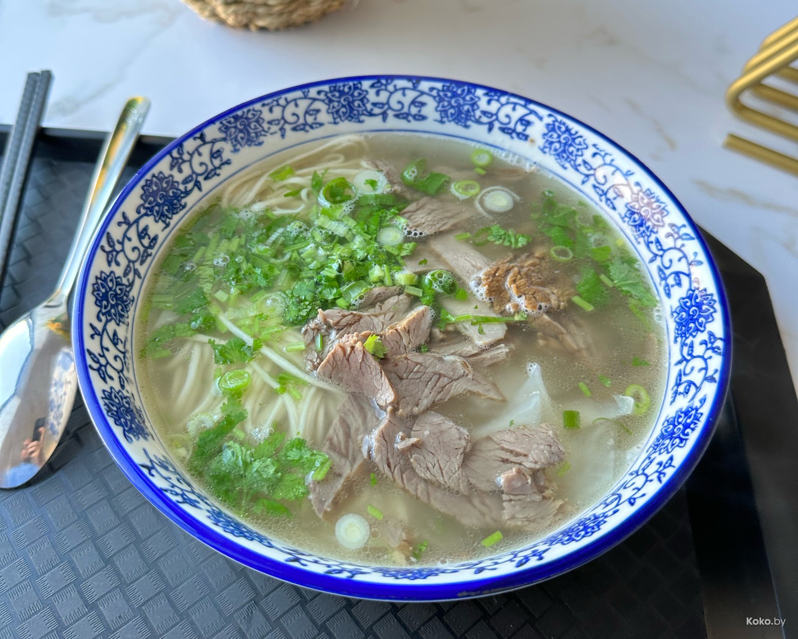 ВАЖНО: белорусский и русский не воспринимают, всё на китайском, так и не узнал название кафе, меню найдёте на стене, там буквально два супа, две лапши и мясная добавка. Принимают только наличку и, вроде, догфрендли, на всякий пожарный собаку бы не приводил.