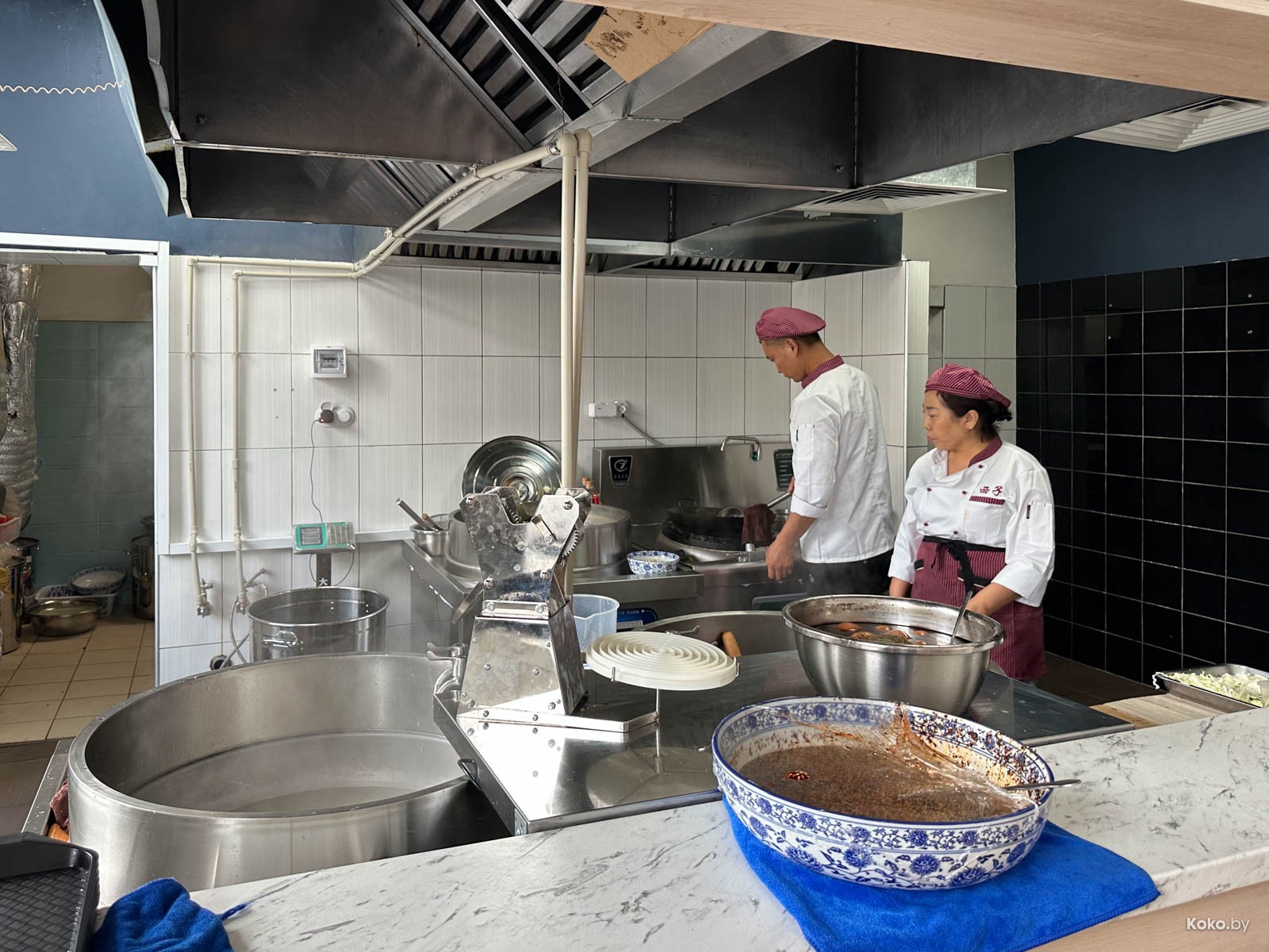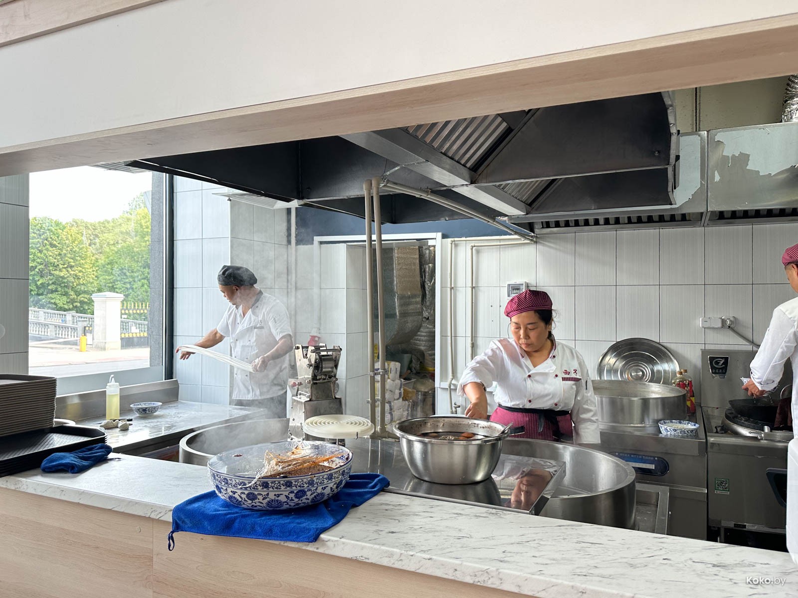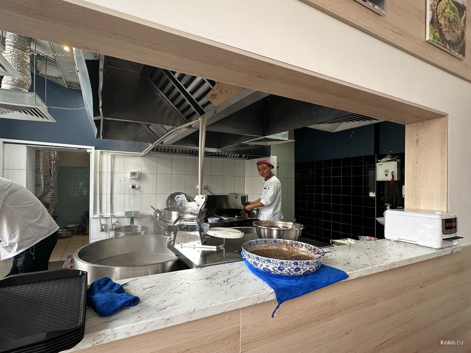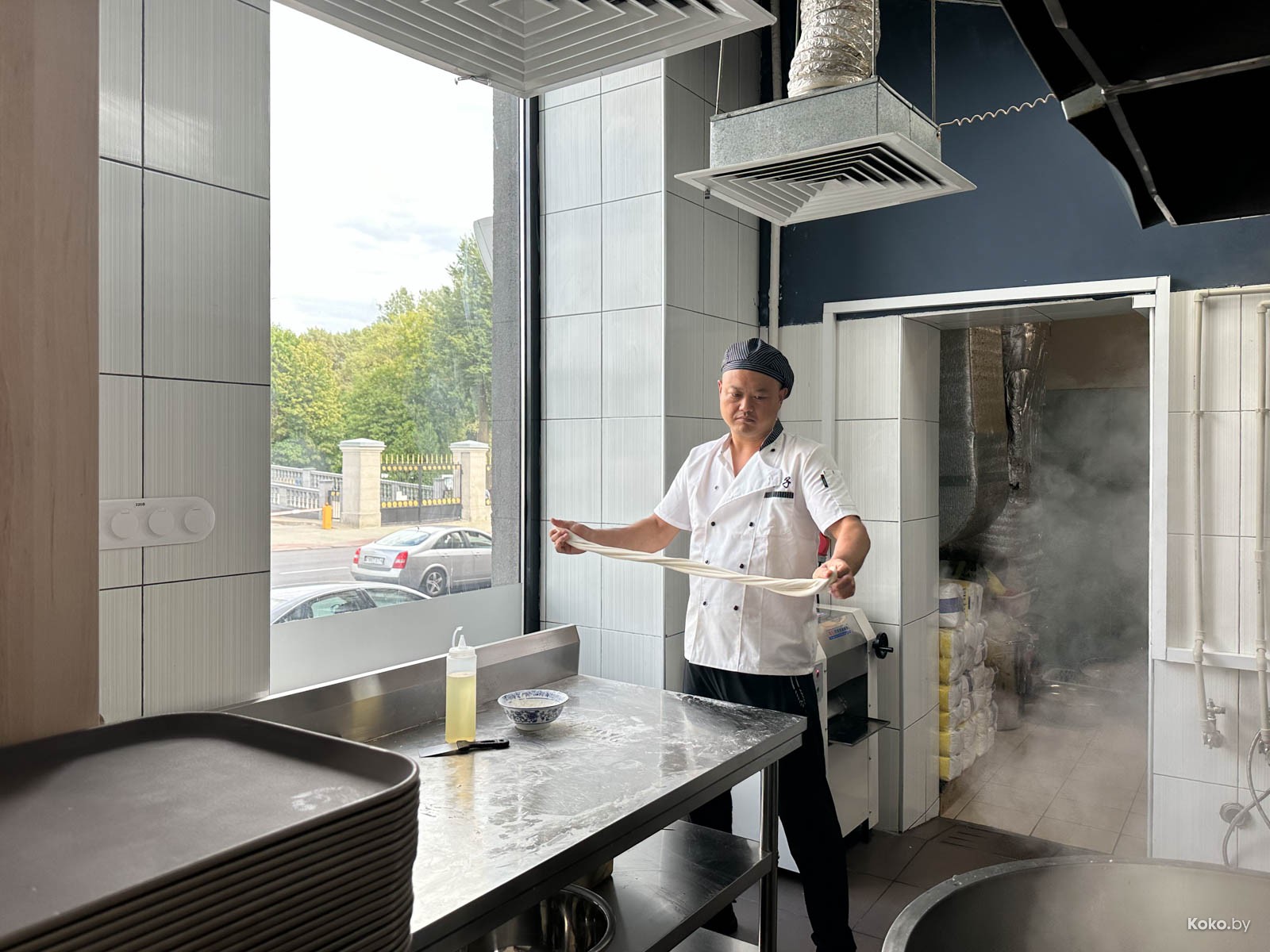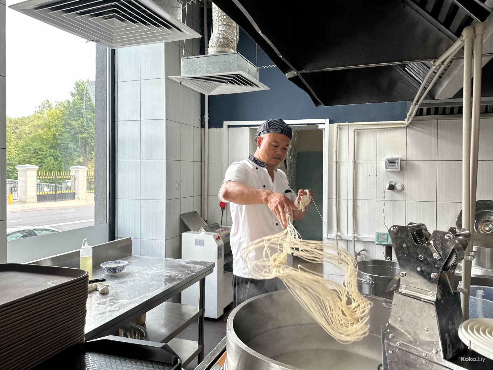 На открытой кухне лапшу растягивают вручную, после закидывают в чан с кипятком, а говяжий бульон литрами наваривают в здоровенных кастрюлях. Оцените масштабы с учётом того, что в меню пару блюд.