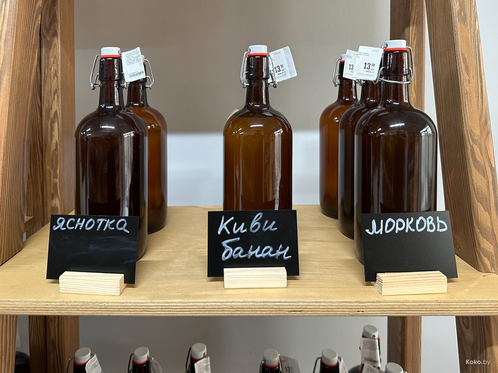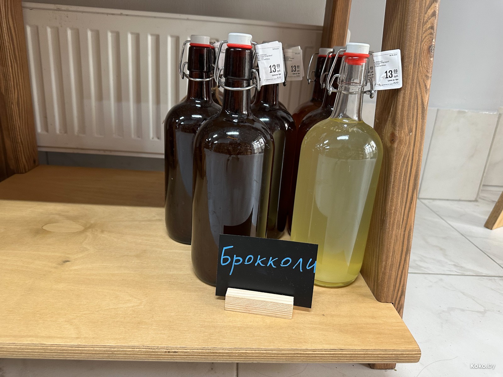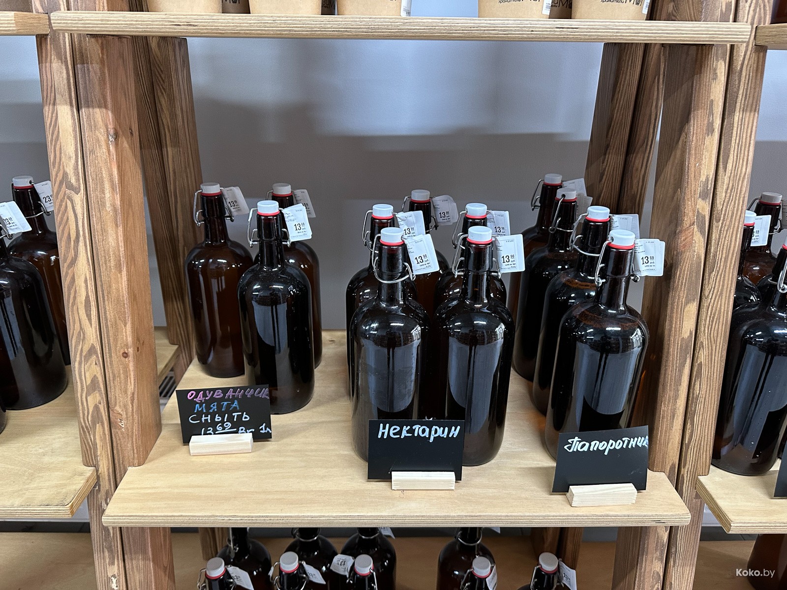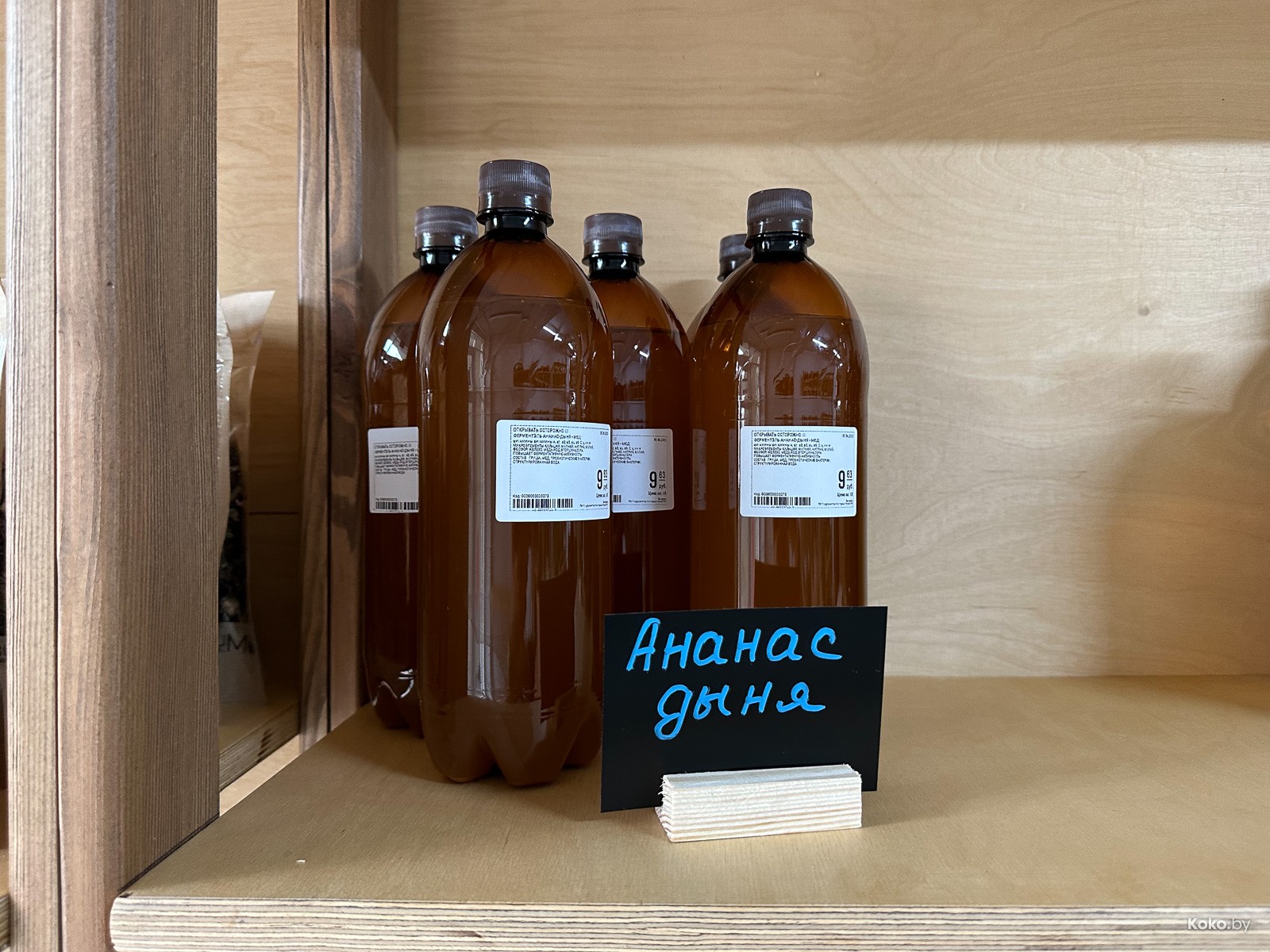 Звучит, как секта, но когда это меня останавливало. Лавка хранителей находится на цокольном этаже в «Маяке Минска», где рядом совсем недавно открыли окно выдачи годной пинсы «Аве почему-то пицца». Внутри магазина атмосфера эко-биолофта, воздух наполнен лёгким ароматом брожения, в конце барная стойка. На стеллажах, как домино, пластиковые и стеклянные бутылки, если бы не название, то решил, что заманили в очередную крафтовую разливайку.