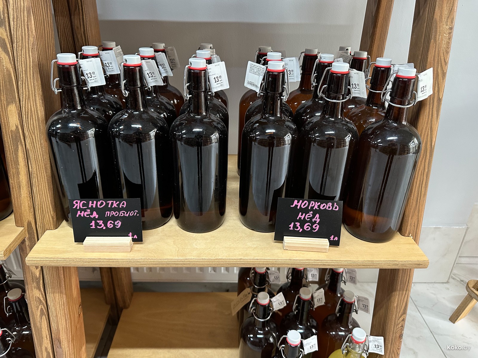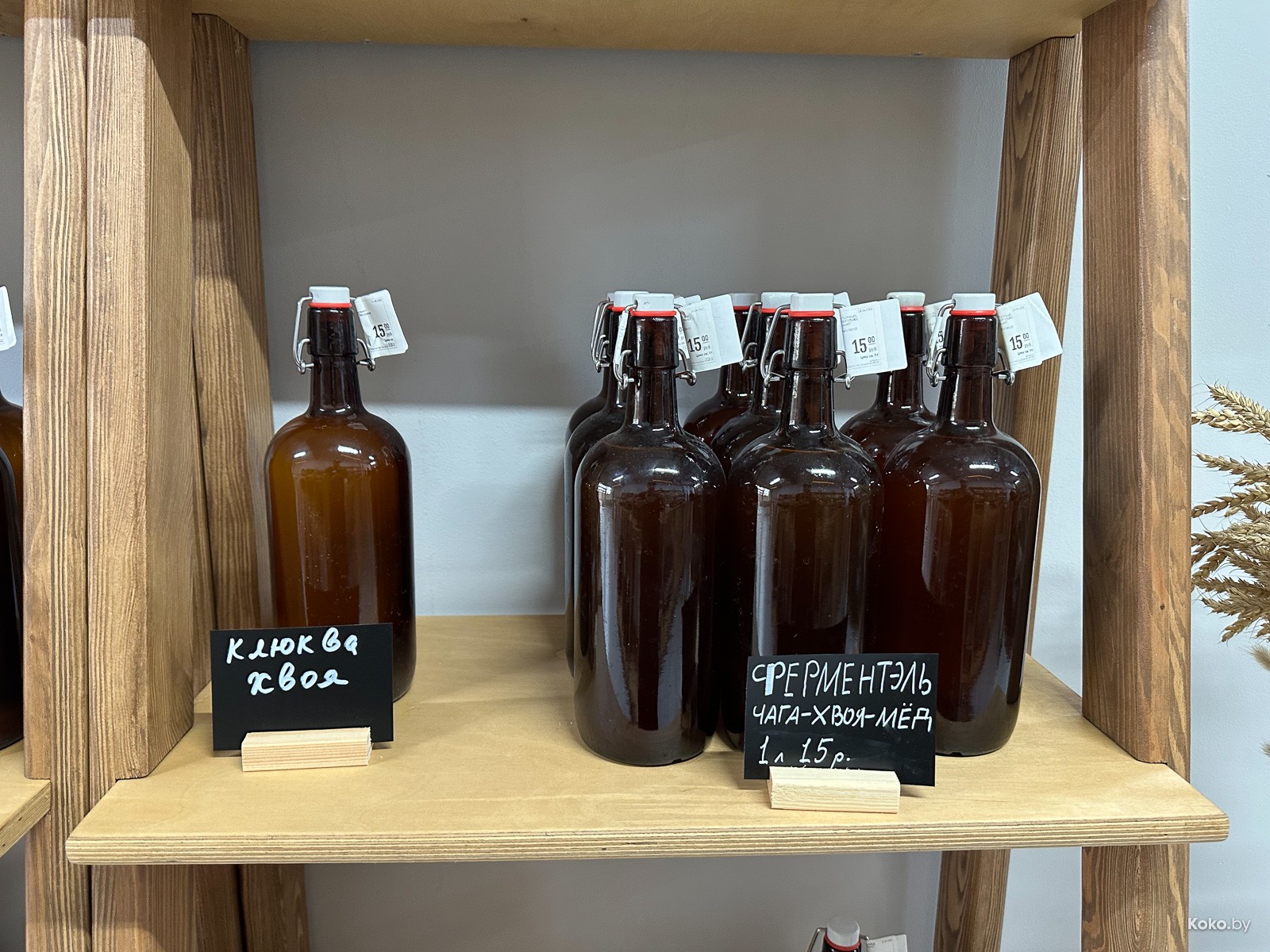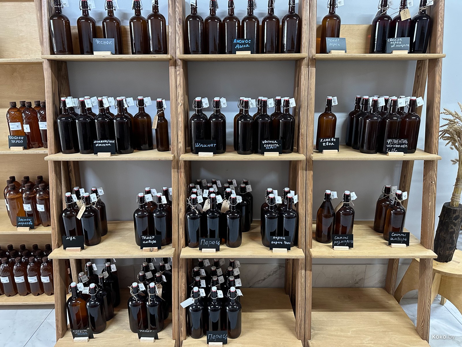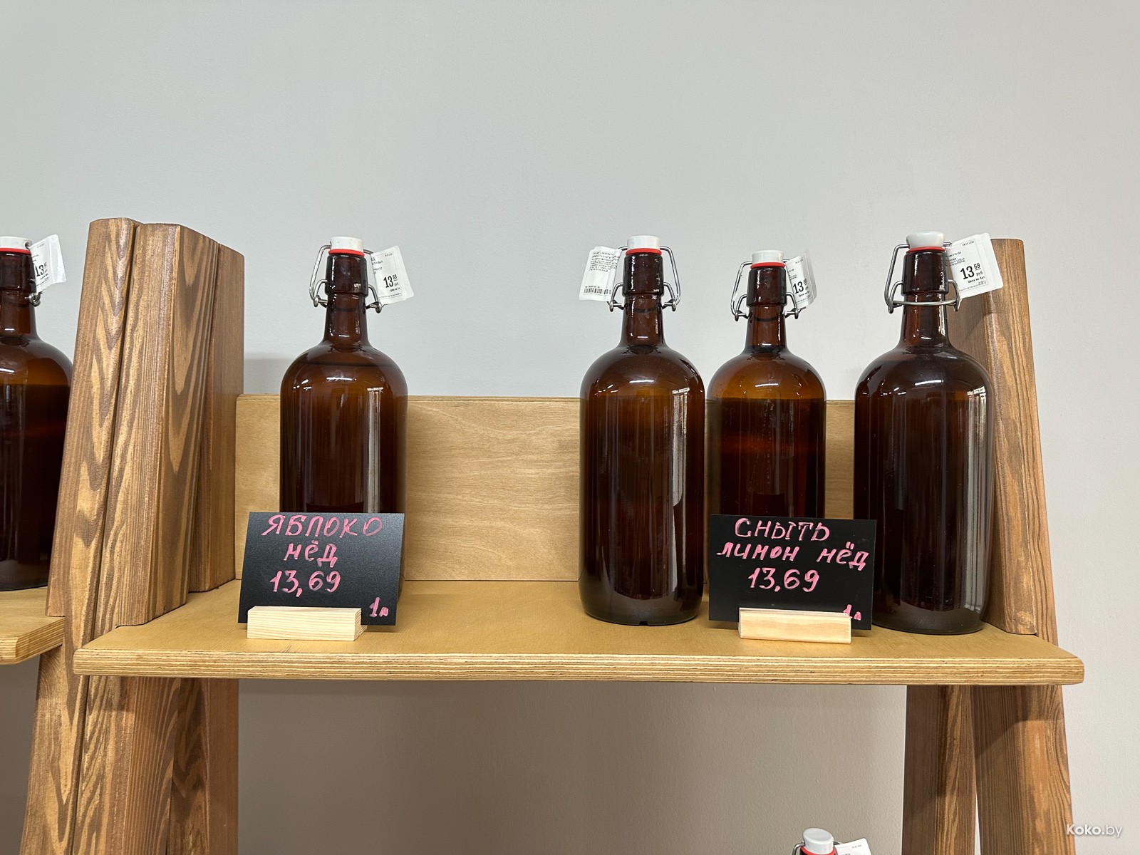 Звучит, как секта, но когда это меня останавливало. Лавка хранителей находится на цокольном этаже в «Маяке Минска», где рядом совсем недавно открыли окно выдачи годной пинсы «Аве почему-то пицца». Внутри магазина атмосфера эко-биолофта, воздух наполнен лёгким ароматом брожения, в конце барная стойка. На стеллажах, как домино, пластиковые и стеклянные бутылки, если бы не название, то решил, что заманили в очередную крафтовую разливайку.
