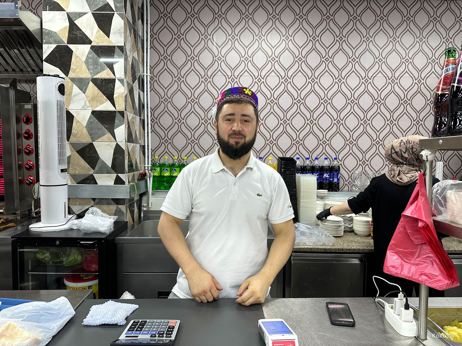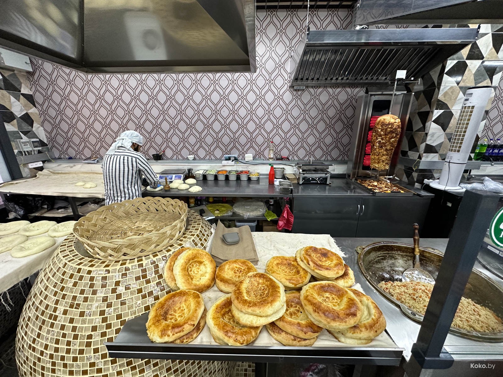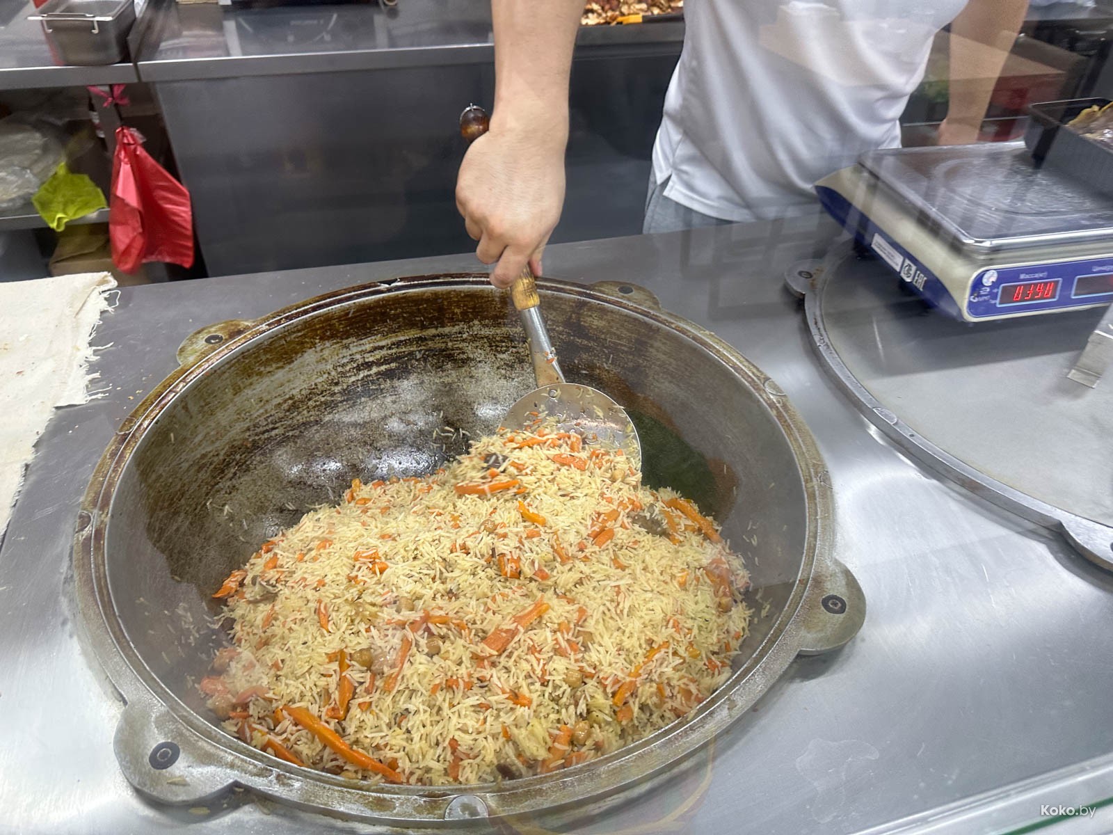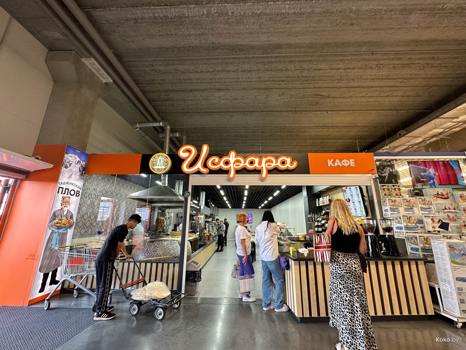 Наводку на город лагмана и плова подкинула наша читательница Ольга, за что ей отдельный поклон. Столовую «Исфара» мы легко нашли в новом корпусе «Экспобела», который построили на кладбище киосков. Заходим через центральный вход, до конца прямо и налево. Следовали мы за густым запахом ароматных специй и только выловленной из печи лепёшки. Аутентичная столовая с линией раздачи, баром свежей выпечки, станцией плова и мясным вертелом.