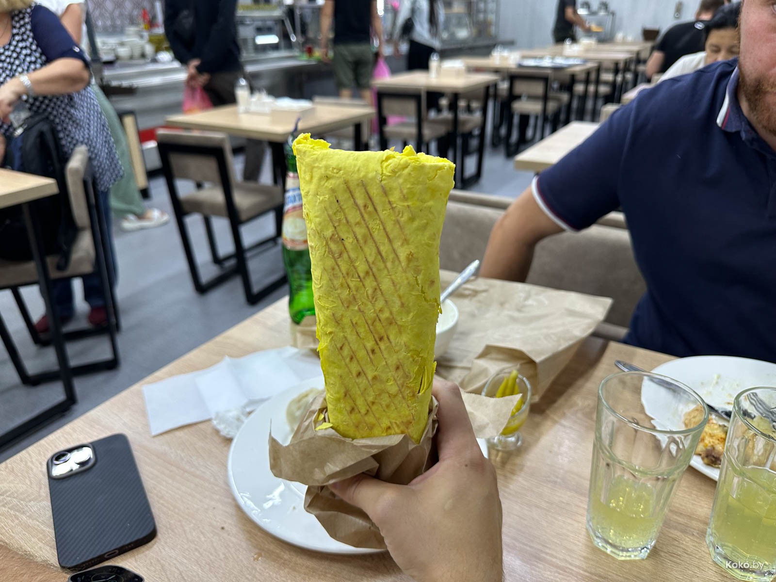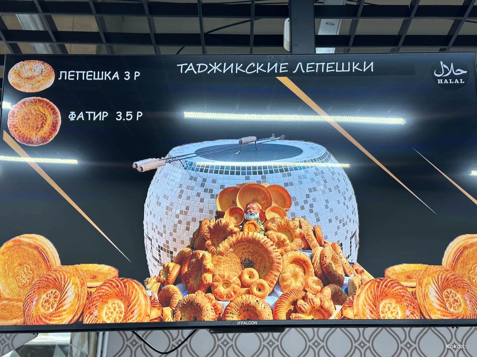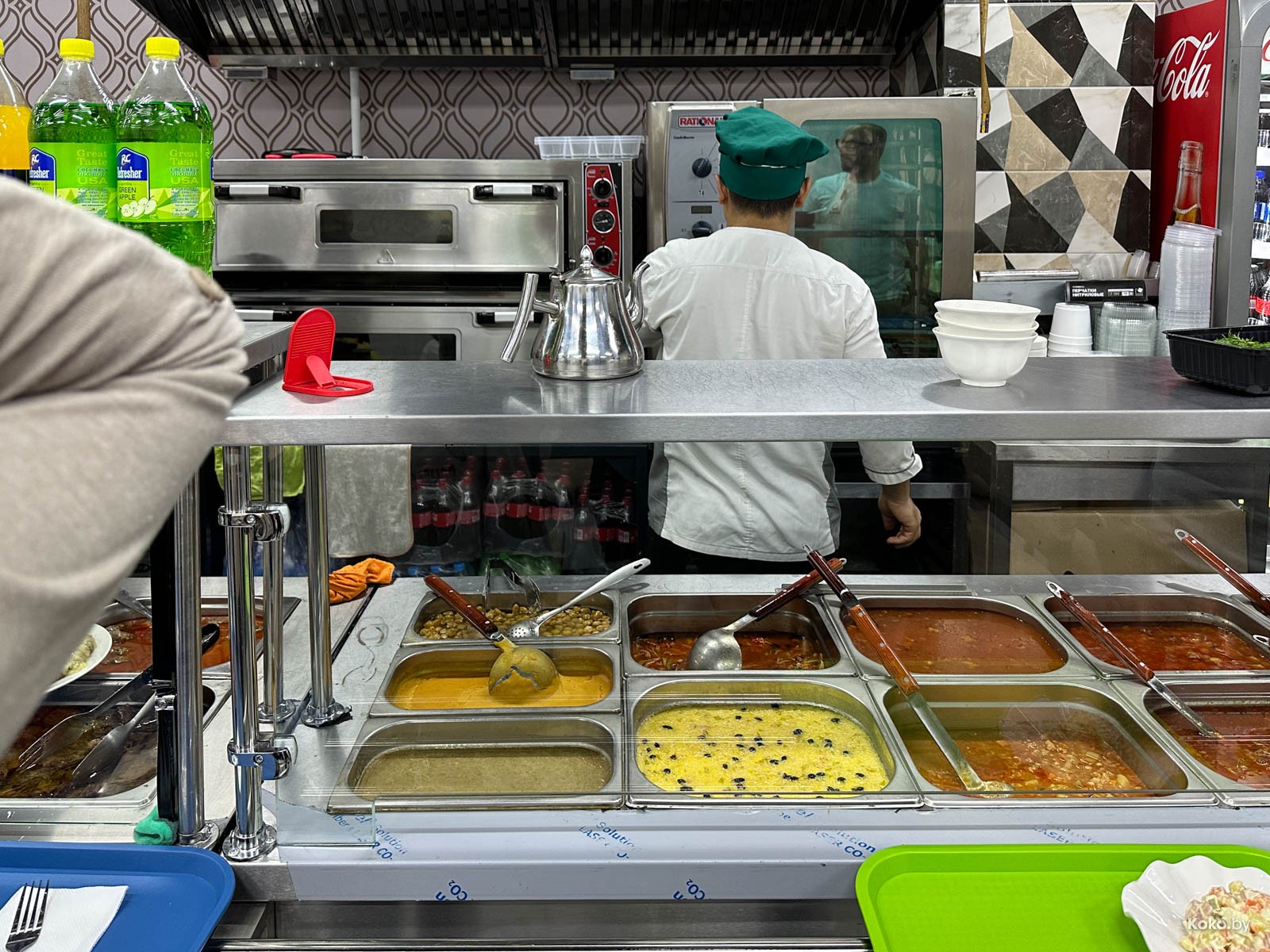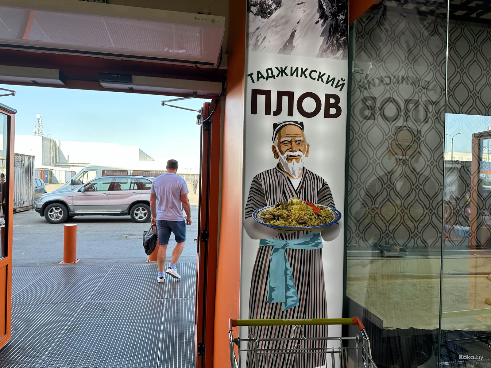 Наводку на город лагмана и плова подкинула наша читательница Ольга, за что ей отдельный поклон. Столовую «Исфара» мы легко нашли в новом корпусе «Экспобела», который построили на кладбище киосков. Заходим через центральный вход, до конца прямо и налево. Следовали мы за густым запахом ароматных специй и только выловленной из печи лепёшки. Аутентичная столовая с линией раздачи, баром свежей выпечки, станцией плова и мясным вертелом.