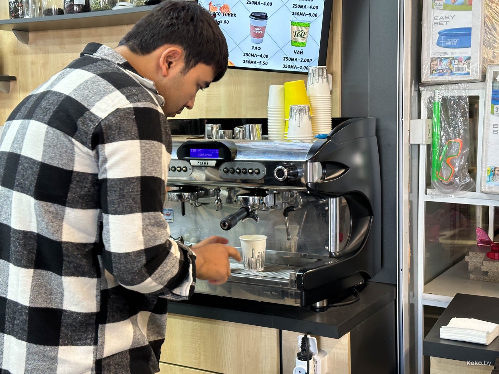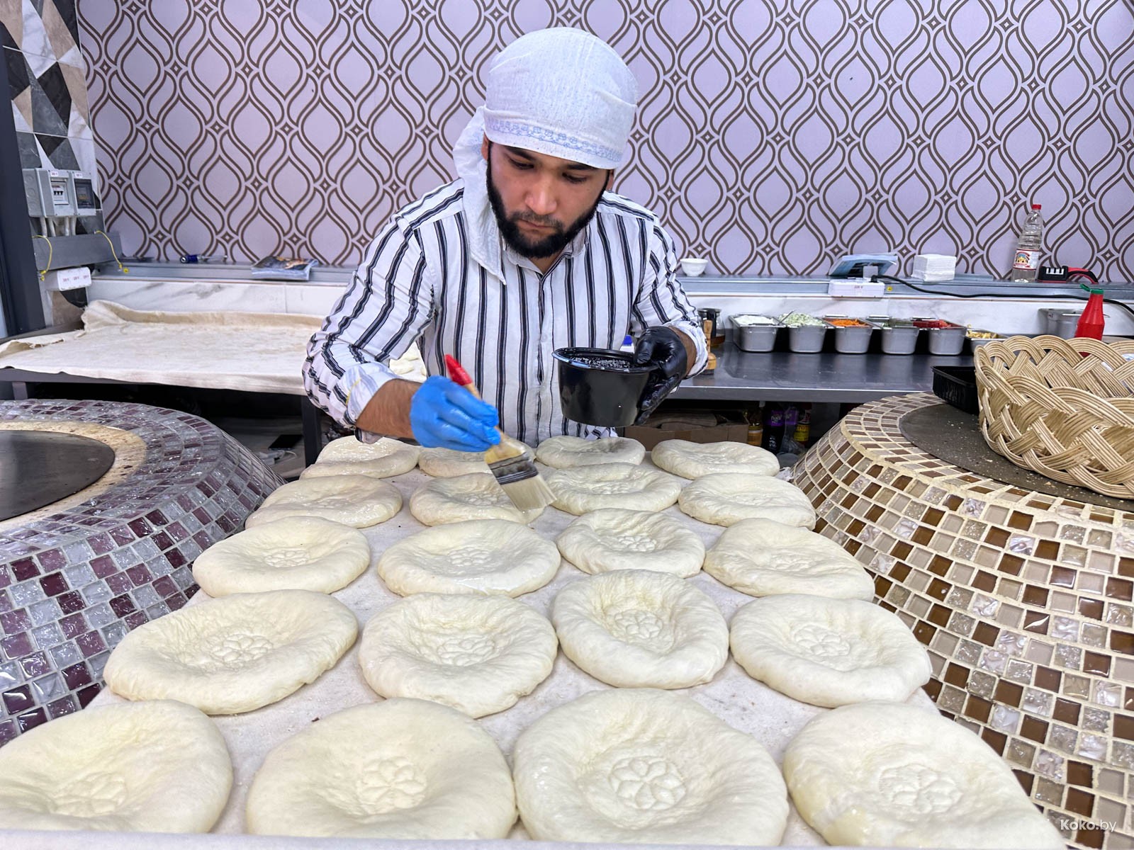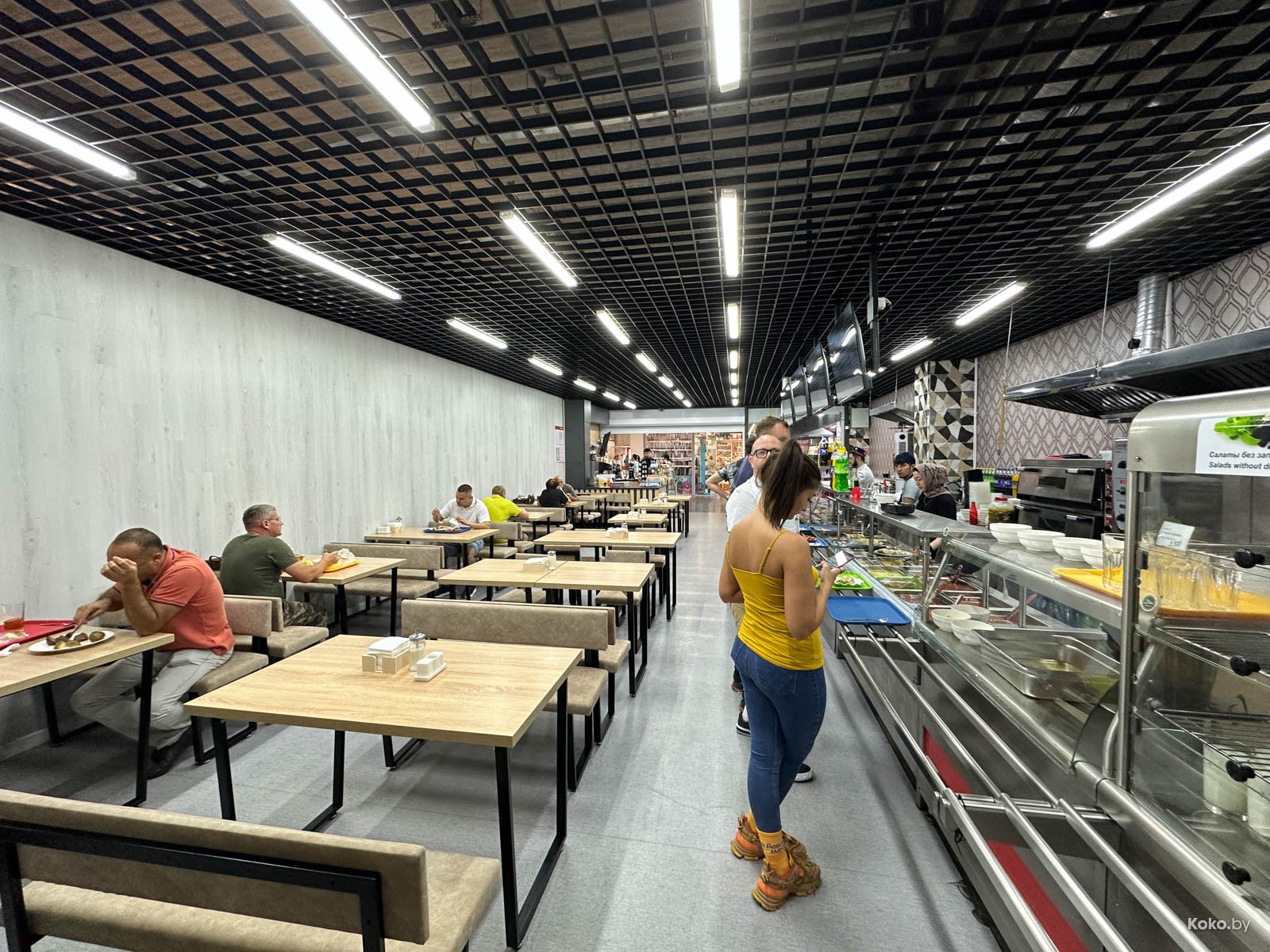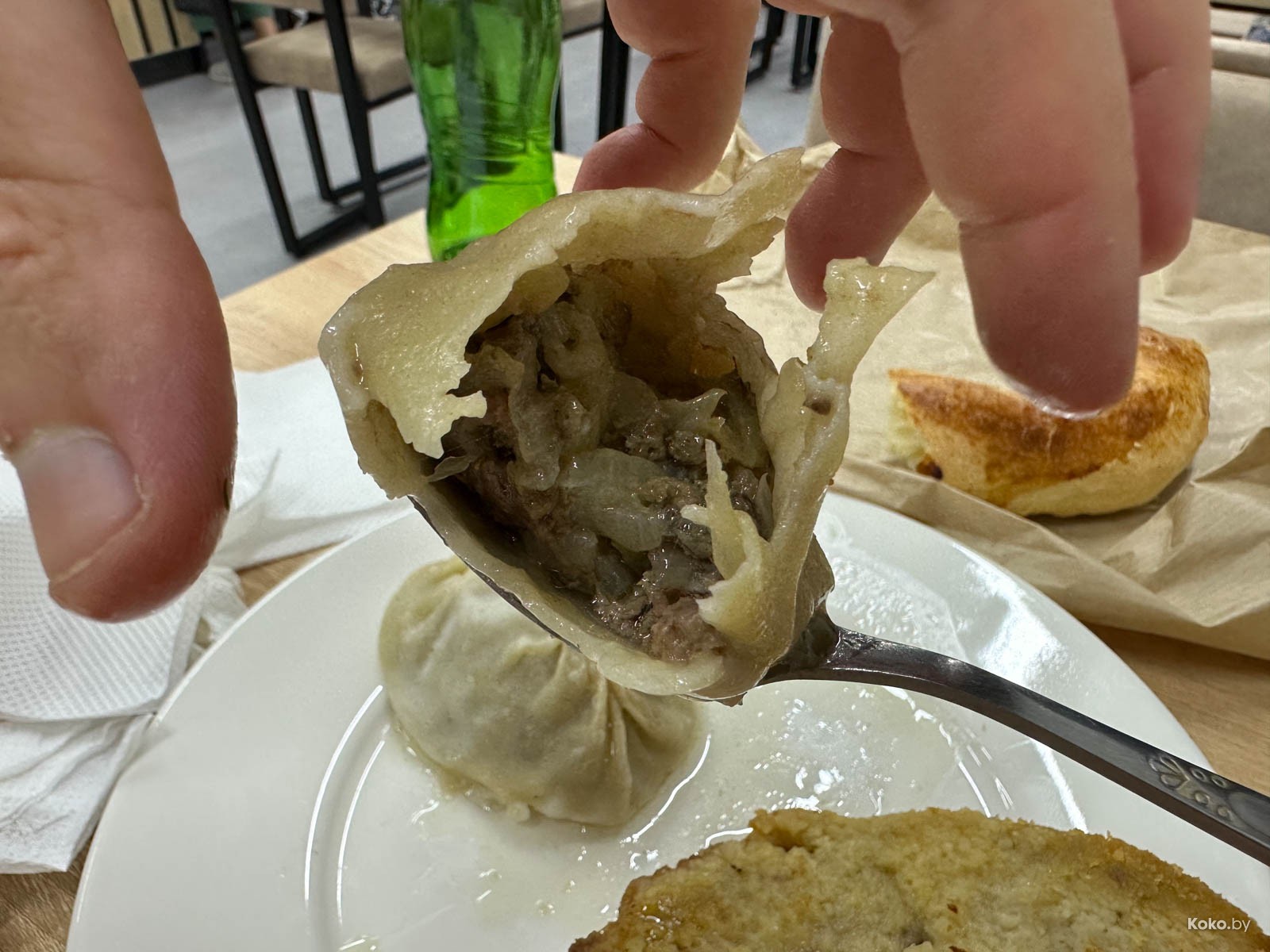 Наводку на город лагмана и плова подкинула наша читательница Ольга, за что ей отдельный поклон. Столовую «Исфара» мы легко нашли в новом корпусе «Экспобела», который построили на кладбище киосков. Заходим через центральный вход, до конца прямо и налево. Следовали мы за густым запахом ароматных специй и только выловленной из печи лепёшки. Аутентичная столовая с линией раздачи, баром свежей выпечки, станцией плова и мясным вертелом.