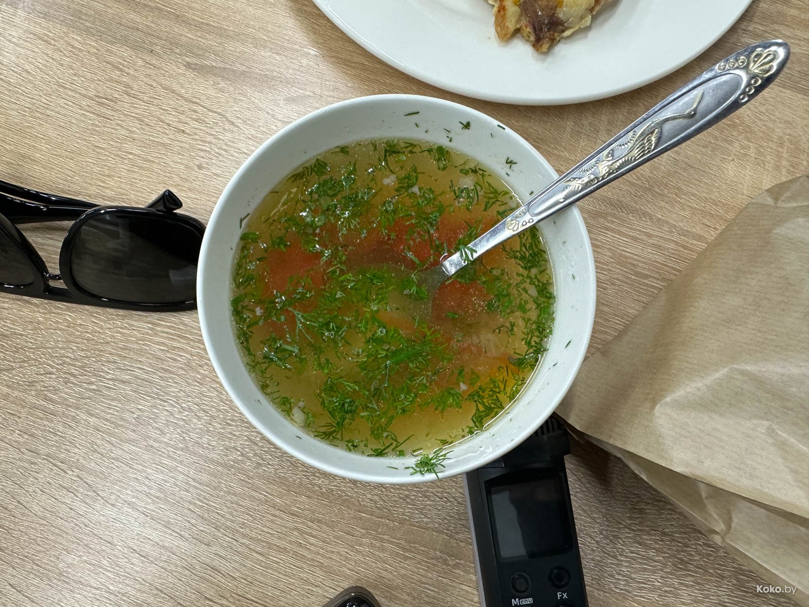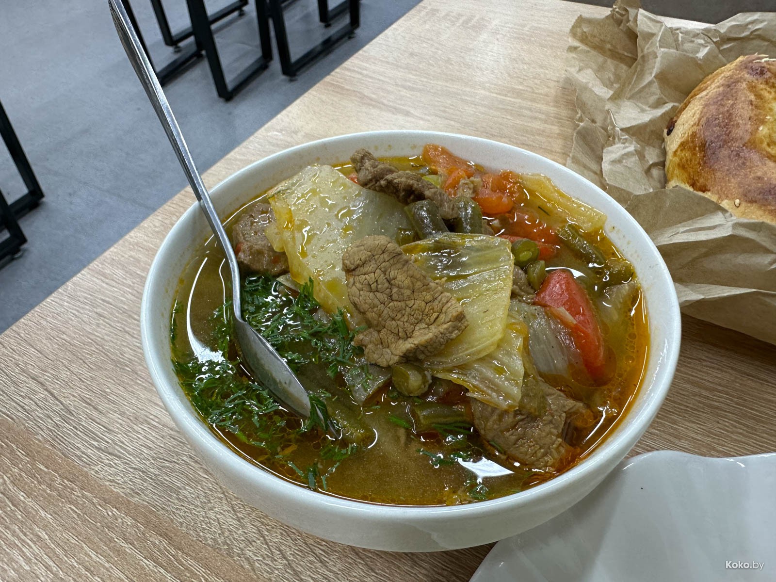 Миска наваристого, нежирного бульона (просите погреть), отдельно отваренное мясо на кости, картошка, нут и морковка. Восторг!