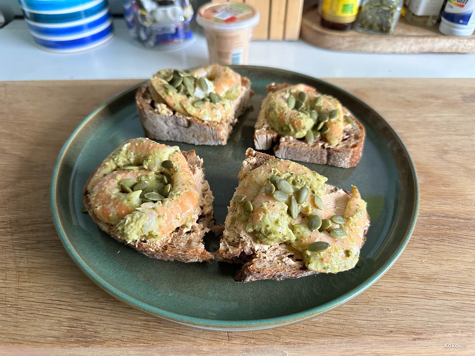 На сухой сковороде он стал ещё и хрустящим. Промазал ломать творожным сыром с вялеными томатами, креветки на акции разморозил, почистил от кишок, промыл и замариновал в баночном песто «Барила».