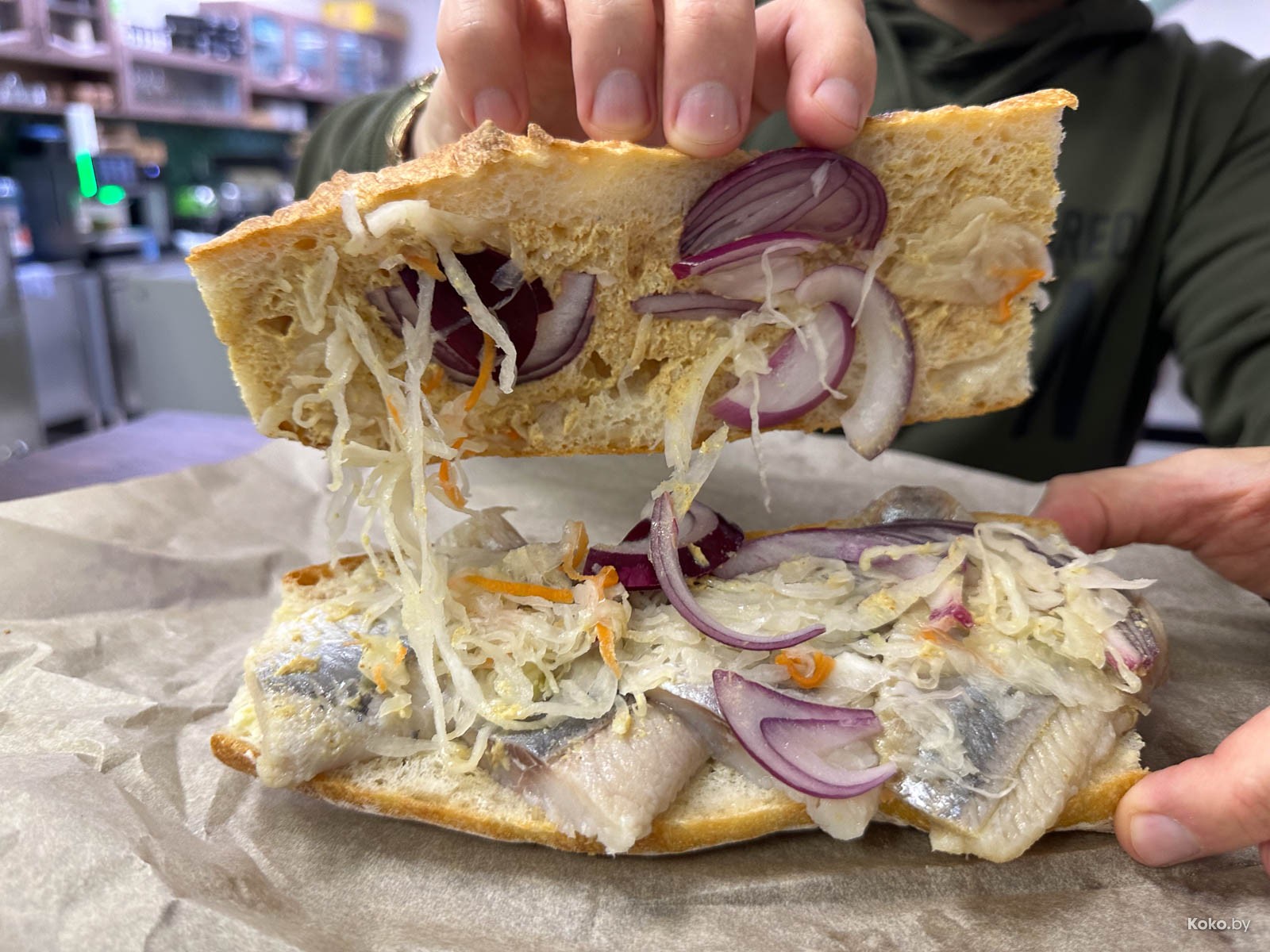 Но рецепт изменил. Пускай филе селёдки будет по-деревенски, в багете с квашеной капустой, красным луком и сладкой горчицей. За сэндвич с бутылкой воды за 2р получилось 18р, однако, селёдка золотая.