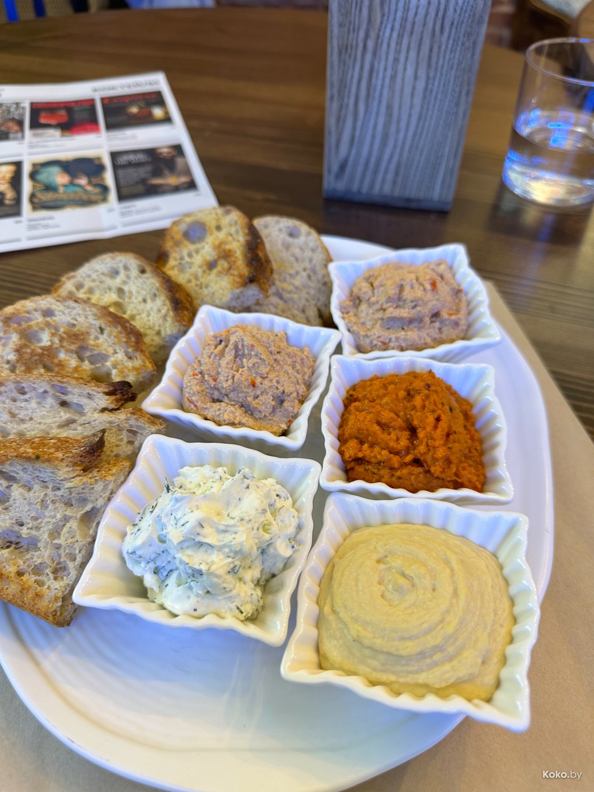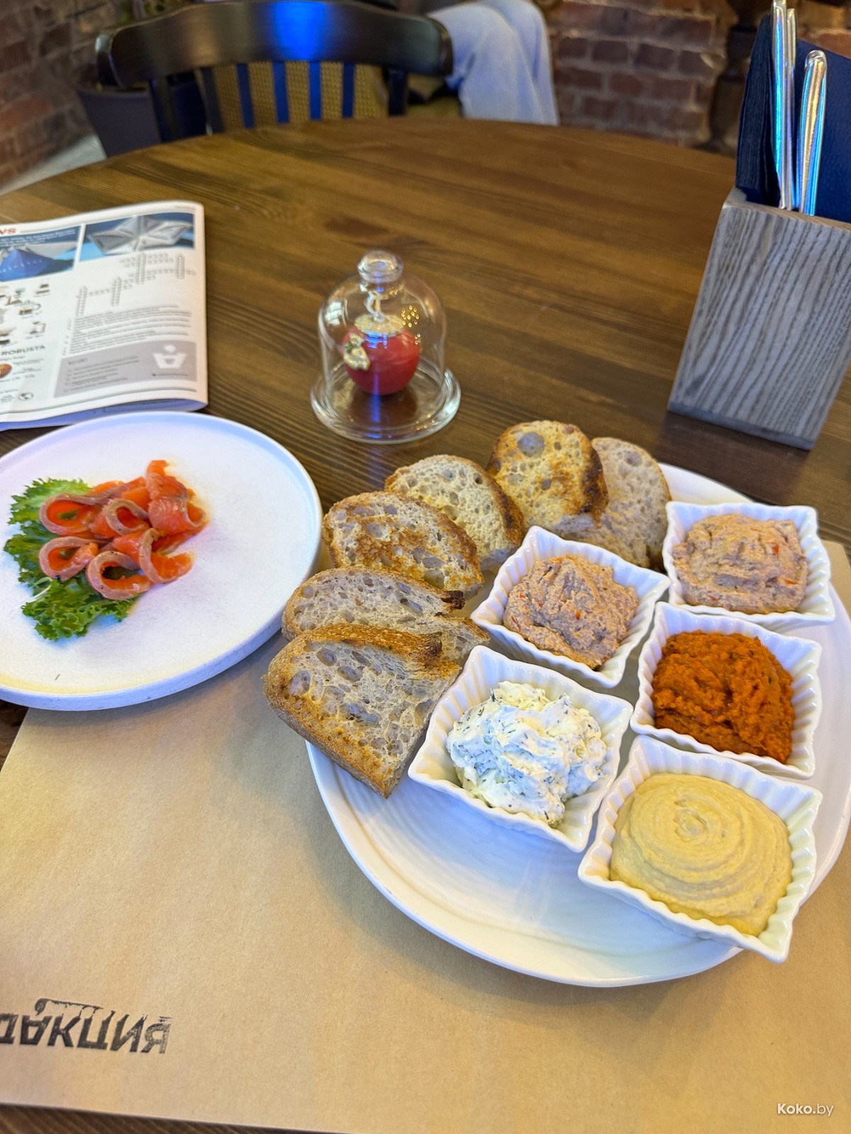 Тут у них творожный сыр по-грузински, морковка с чесноком по-корейски, ещё раз по-грузински с орехами и печёным перцем и гуакамоле из авокадо, который сегодня не вырос. Вкуснотье, но долго.
