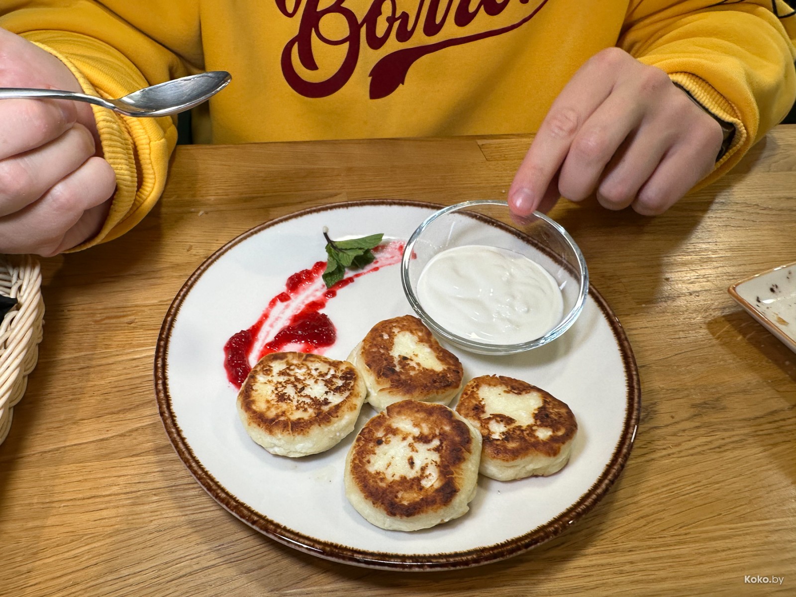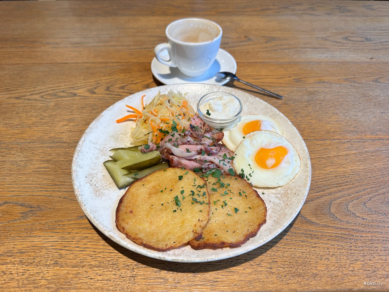 Сытный завтрак по рецепту белорусских деревень за 14,90р c хрустящими драниками, глазами из глазуньи, беконом, капустой, огурчиками и сметаной. Драниками ни одно блюдо не испортишь!
