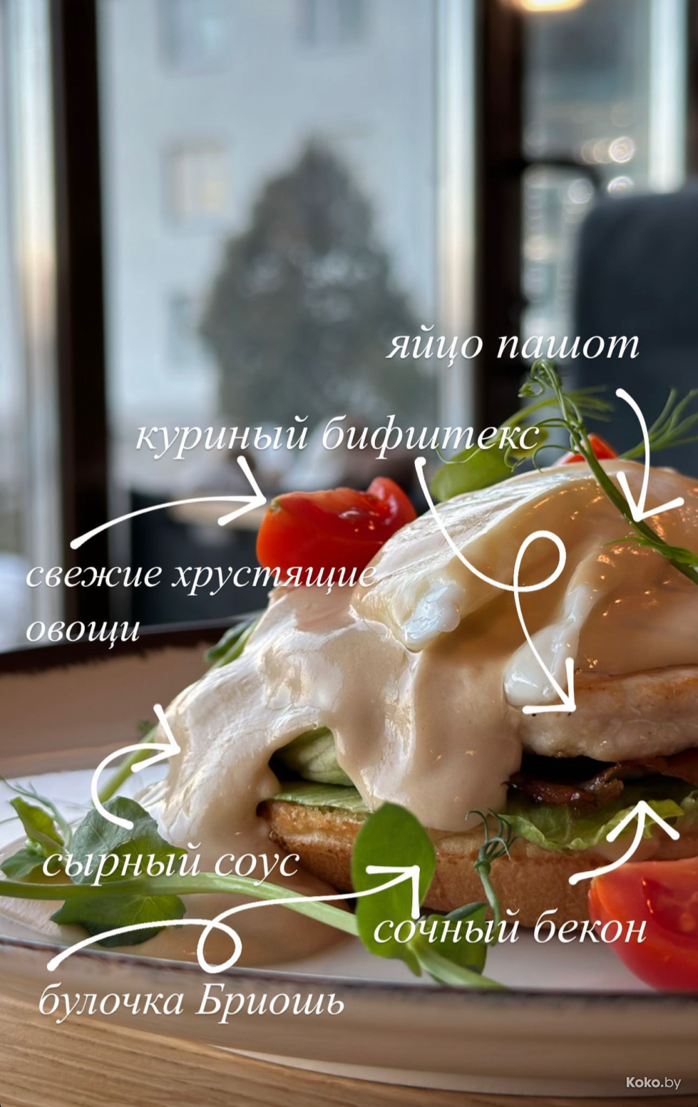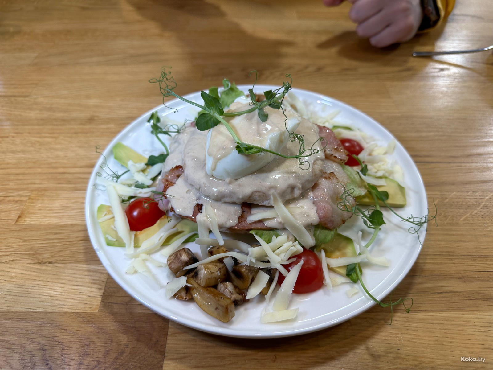 2. К фирменному завтраку Амели за 17р добавил сыр, авокадо и шампиньоны. Визуально, как бургер без булки или домашний Бенедикт с куриной котлетой, каким-то соусом и неудавшимся яйцом пашот.