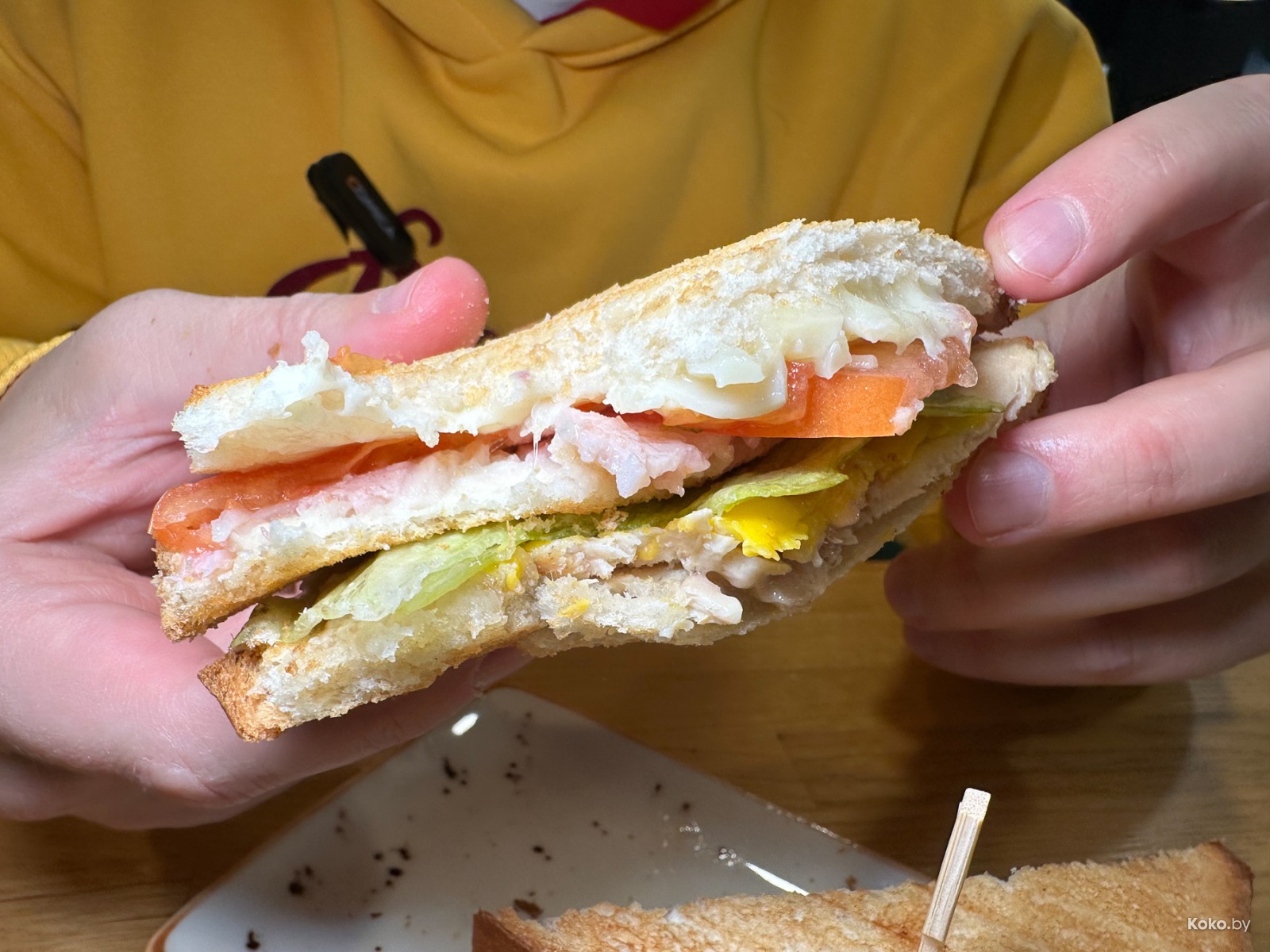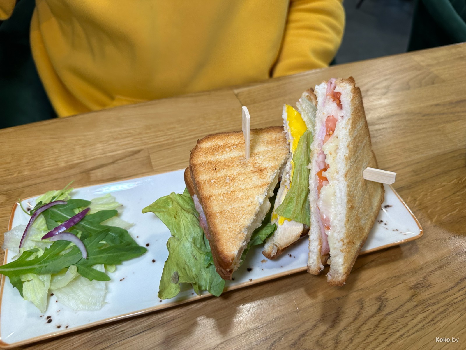 3. Возвращаемся к рецептам «Амели», клаб-сэндвич из трёх тостов с ветчиной, сыром, помидором, салатом и соусом за 18р. Вкусно, но дорого.