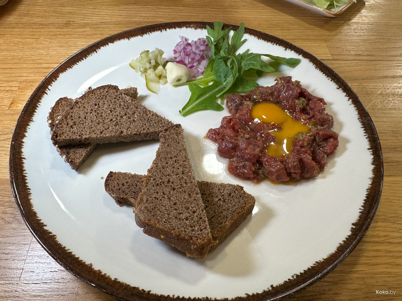 4. Тартар из говядины за 20р выглядит подозрительно. Порция детская, помятое мясо заправлено вкусно, перепелиный желток плохо отделили от белка, вчерашний хлеб забыли положить на гриль. Зубчик чеснока, чтобы хлебушек натереть, вот это падабайка! Обратно на кухню.