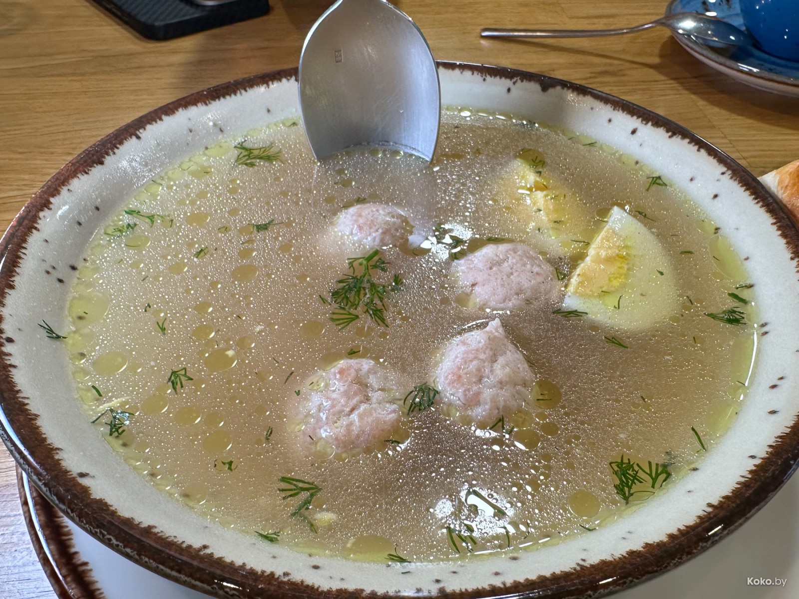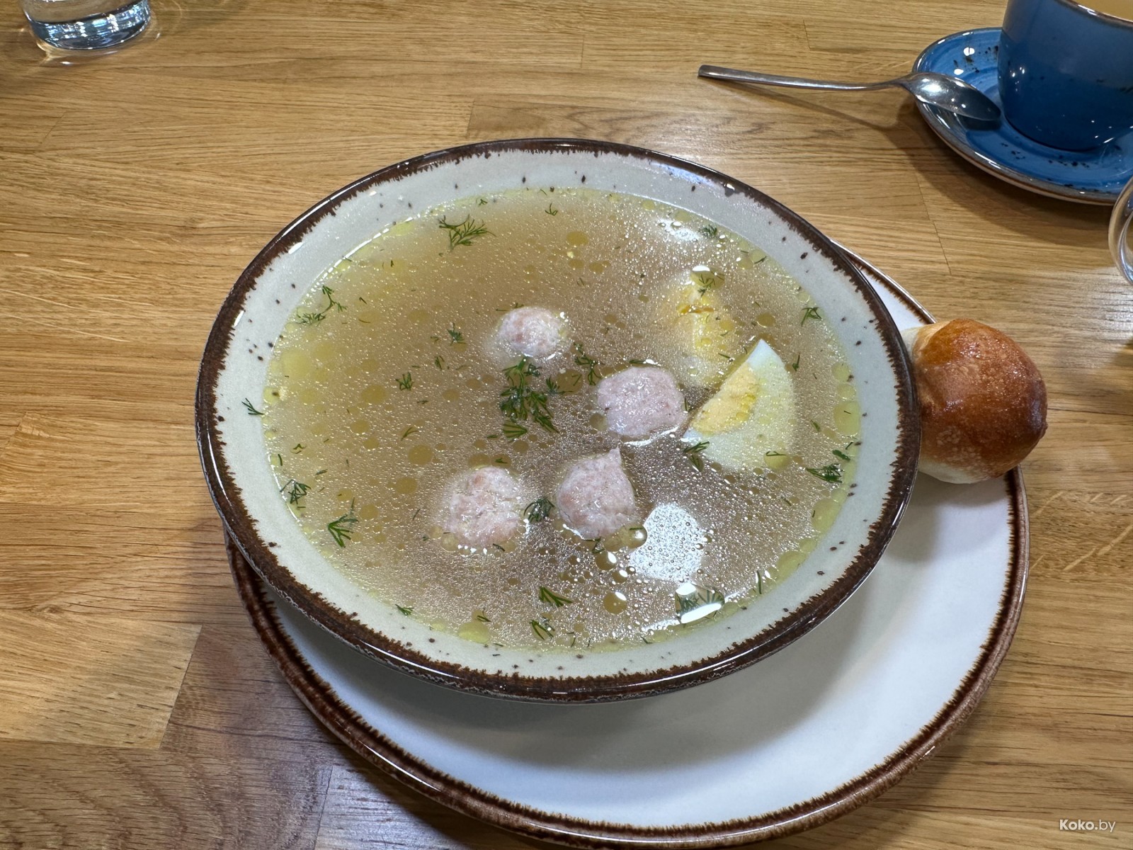 1. Быстрее сообразили честную порцию куриного бульона с домашними тефтельками за 8р из основного меню. Не уверен, своего ли навара или концентрат, но бульон прям в сердечко, то что нужно утром.