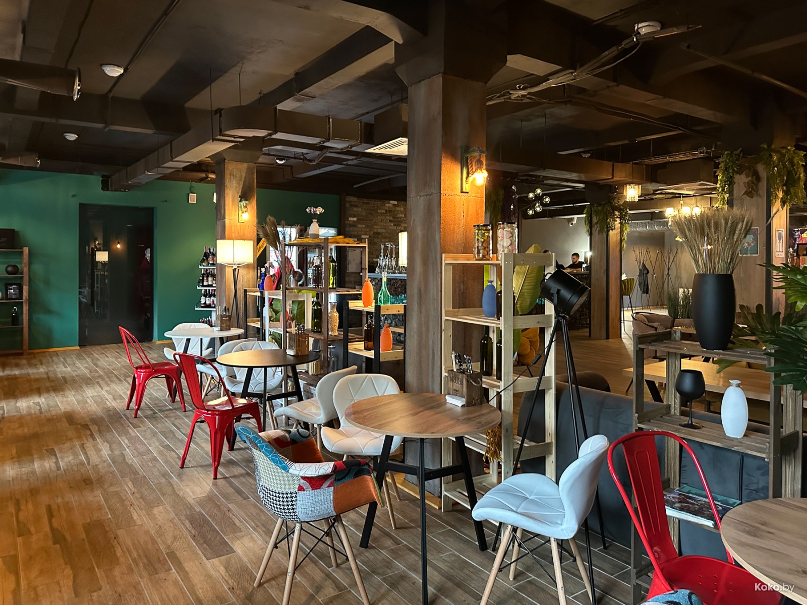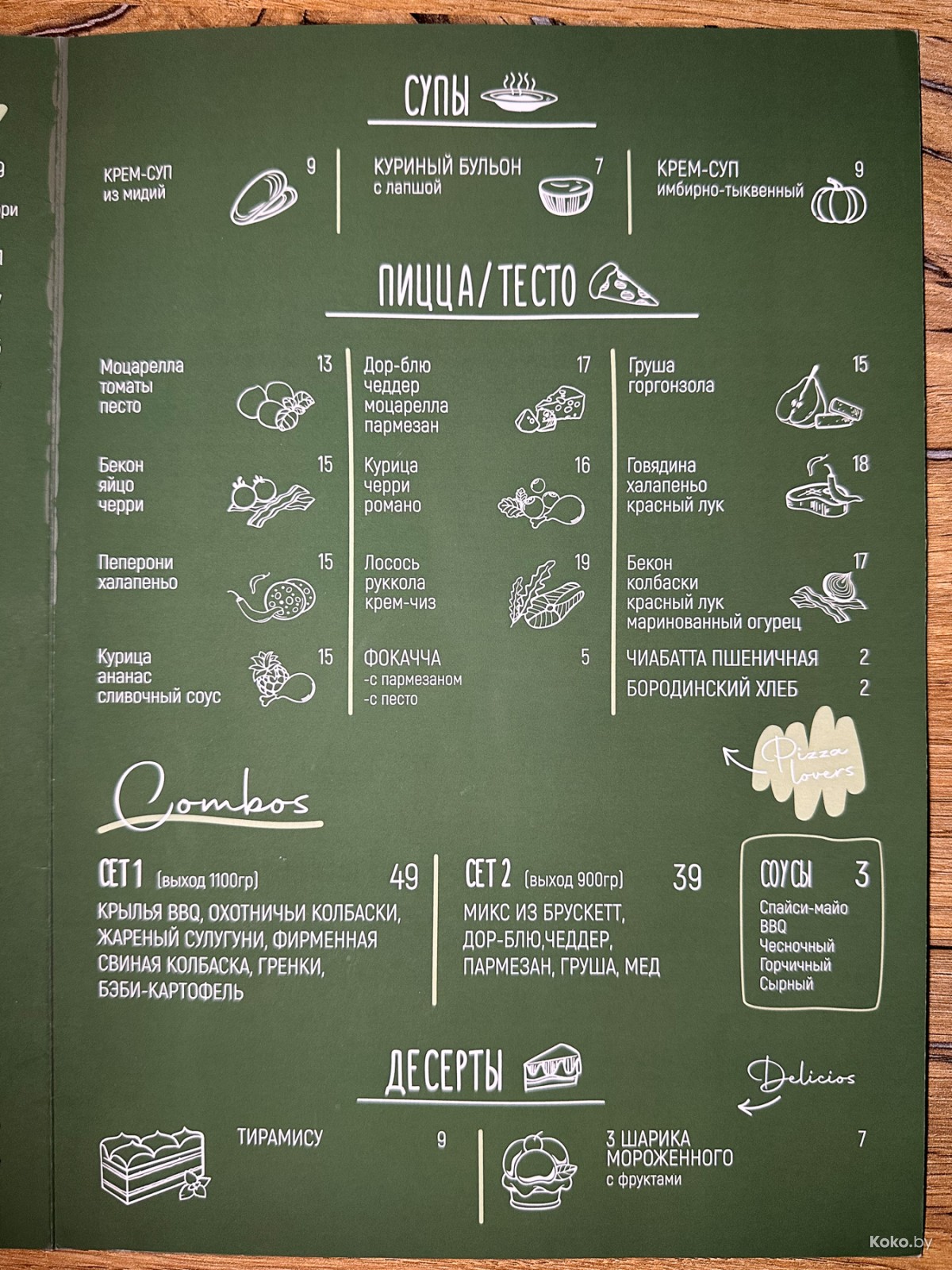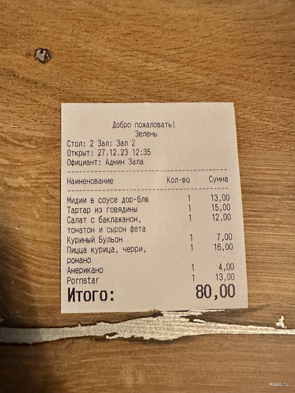Может помните, жила-была такая «Библиотека вина» на Богдановича, где любую бутылку вина можно было взять со шкафа плюс-минус по цене магазина и там же употребить? Вот, забегая на пару абзацев вперёд, эта новая «Зелень» схожа по ценовой концепции и формату. Цены ниже-ниже средних, понятная еда без хот-догов с крабами, мягкие кресла, но странная локация. Реальный пример: стол из пяти блюд и коктейля обошёлся в 80р, дешевле самой дорогой пиццы.