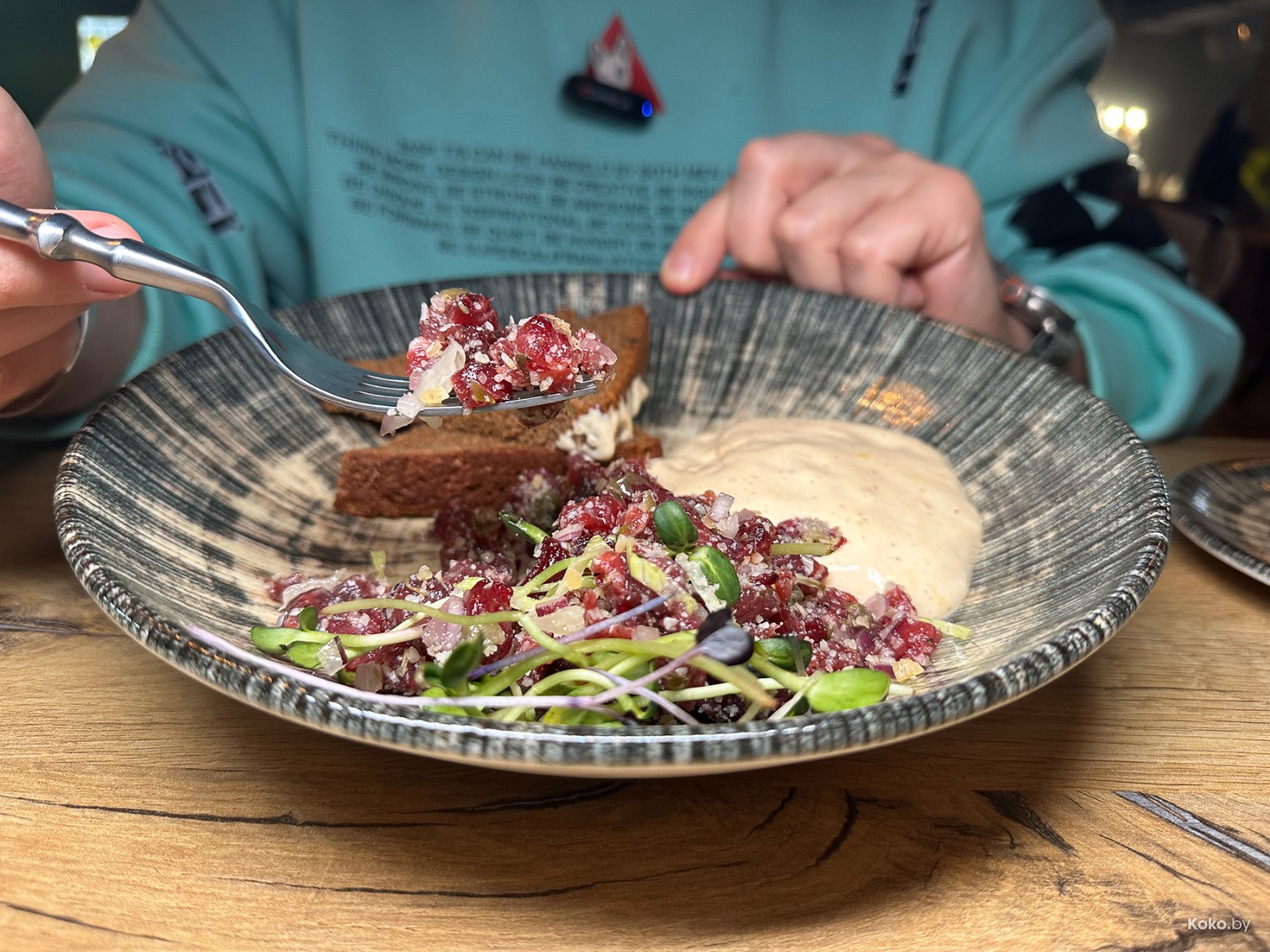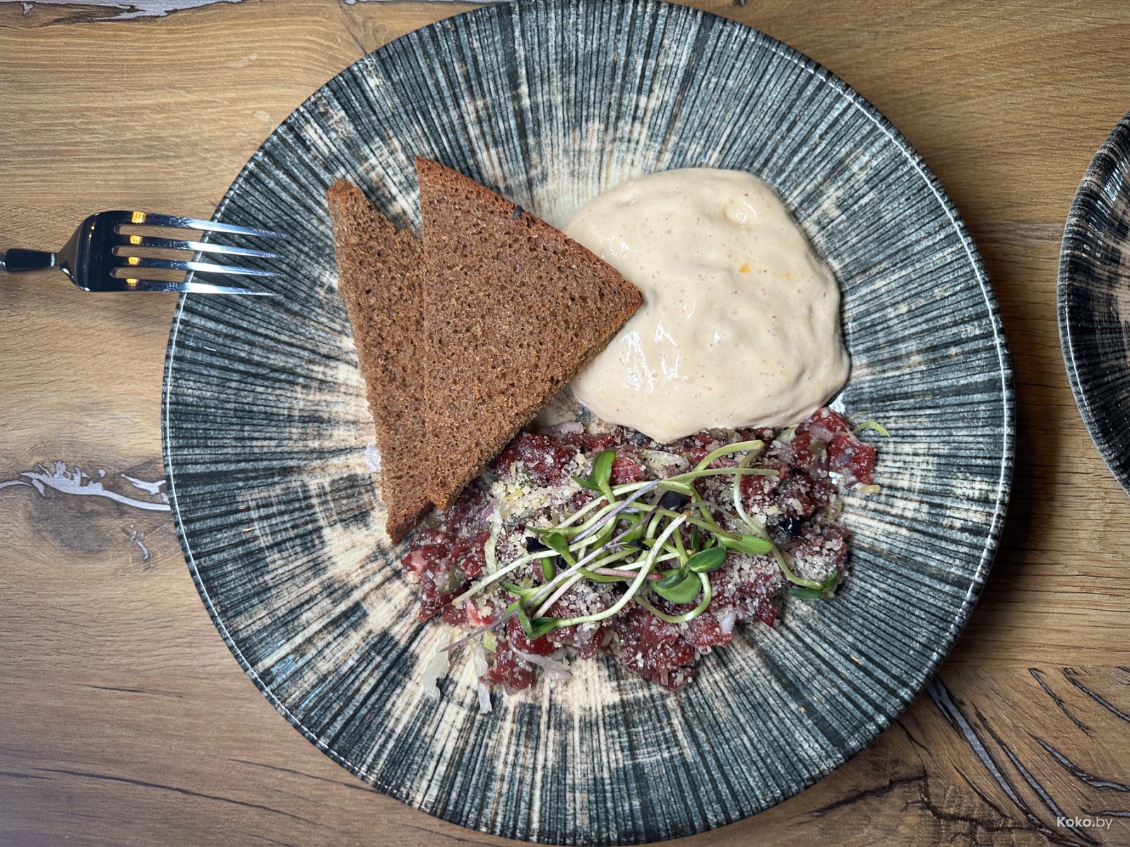 Красиво порубленная кубиком упругая говядина (думаю не вырезка) с трюфельным муссом и магазинным хлебом гриль. За 15р это топ из топа!