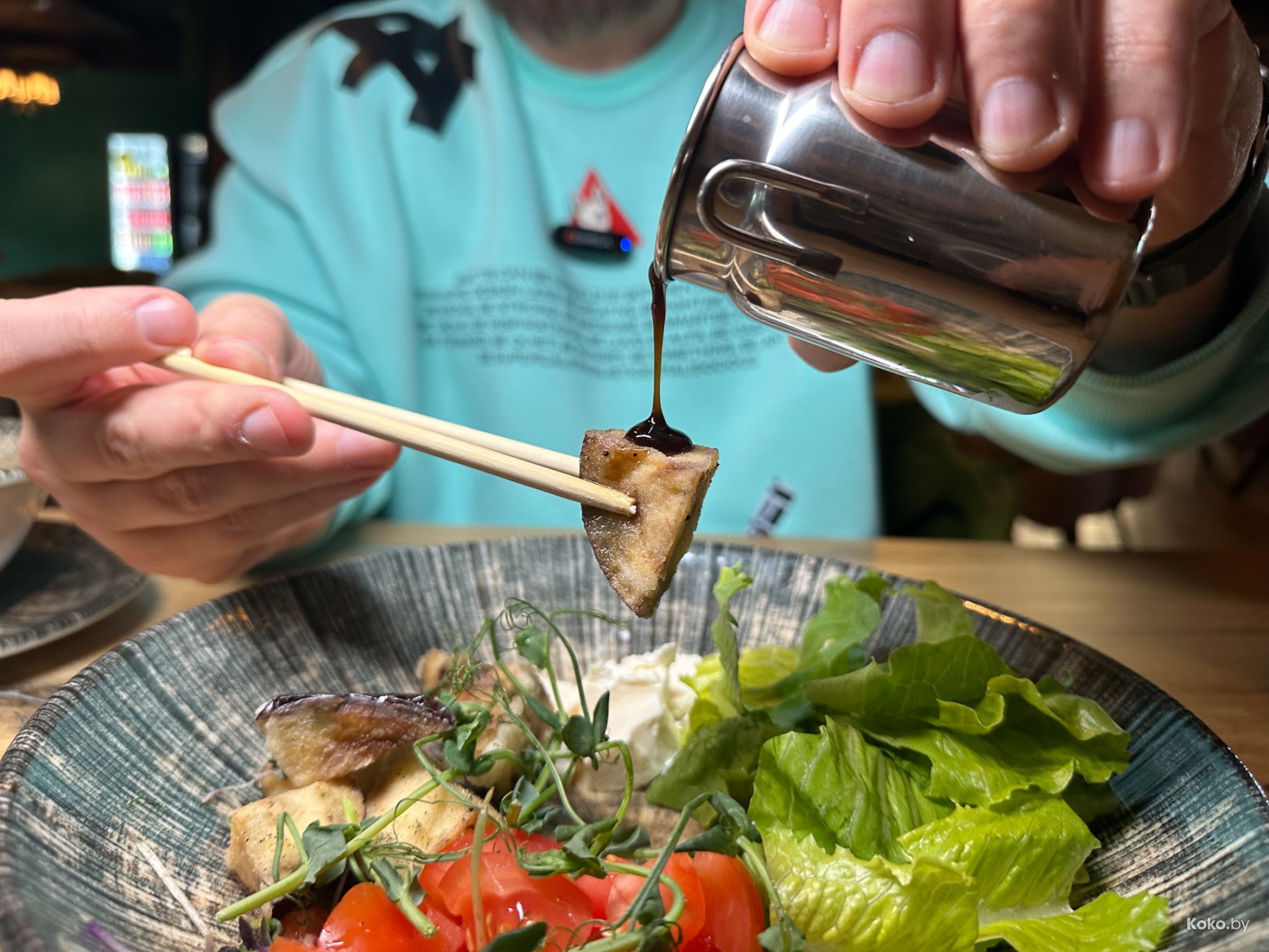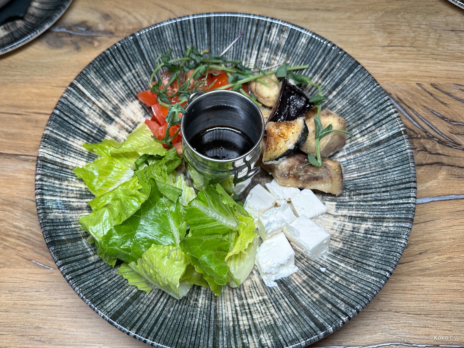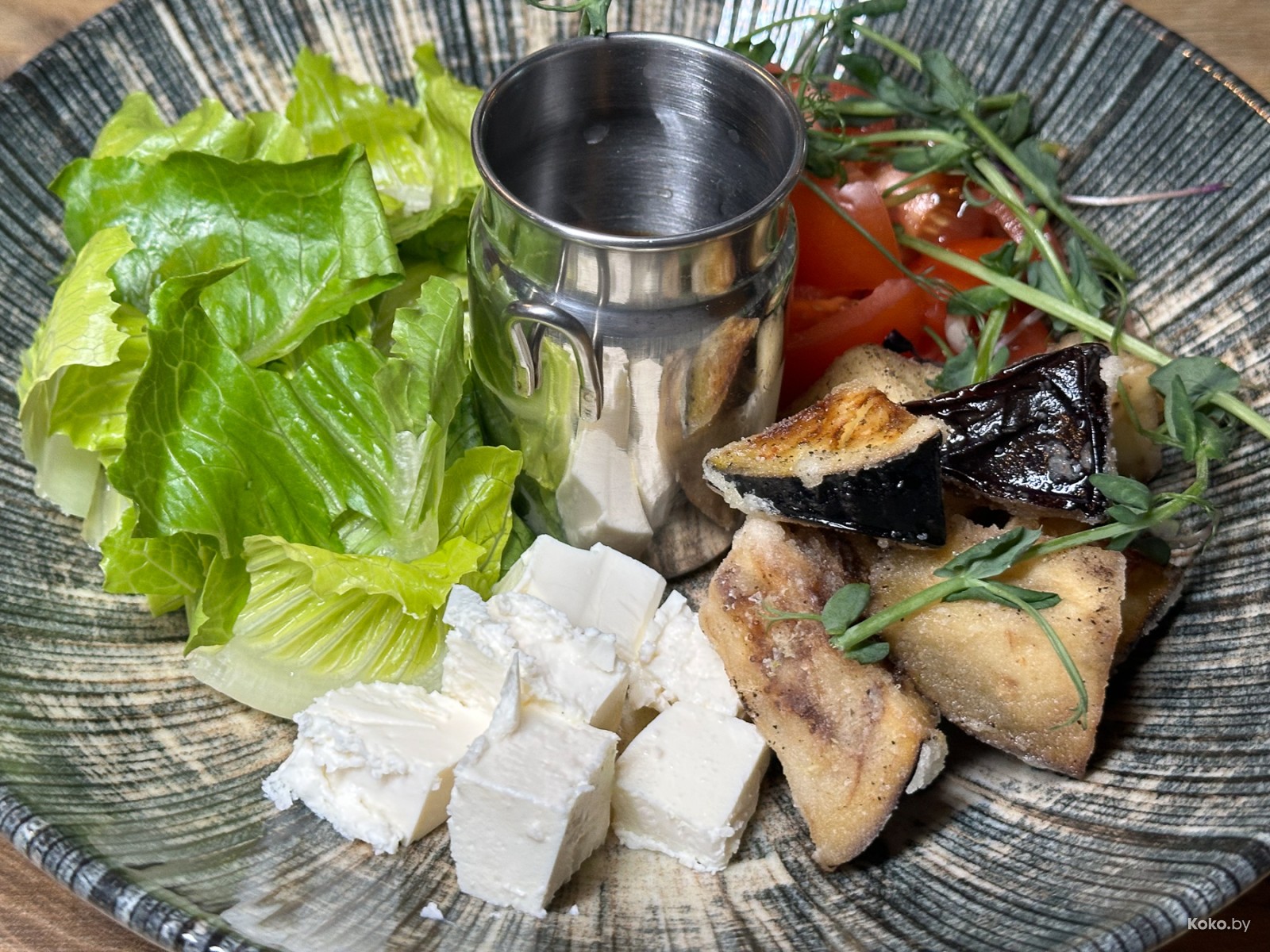 2. Мидии? Нет, это разделённый салат с хрустящим баклажаном и сыром Фета за 13р. Гармоничное сочетание базовых продуктов со странной подачей с бидончиком азиатского соуса. Чисто девичья тема.