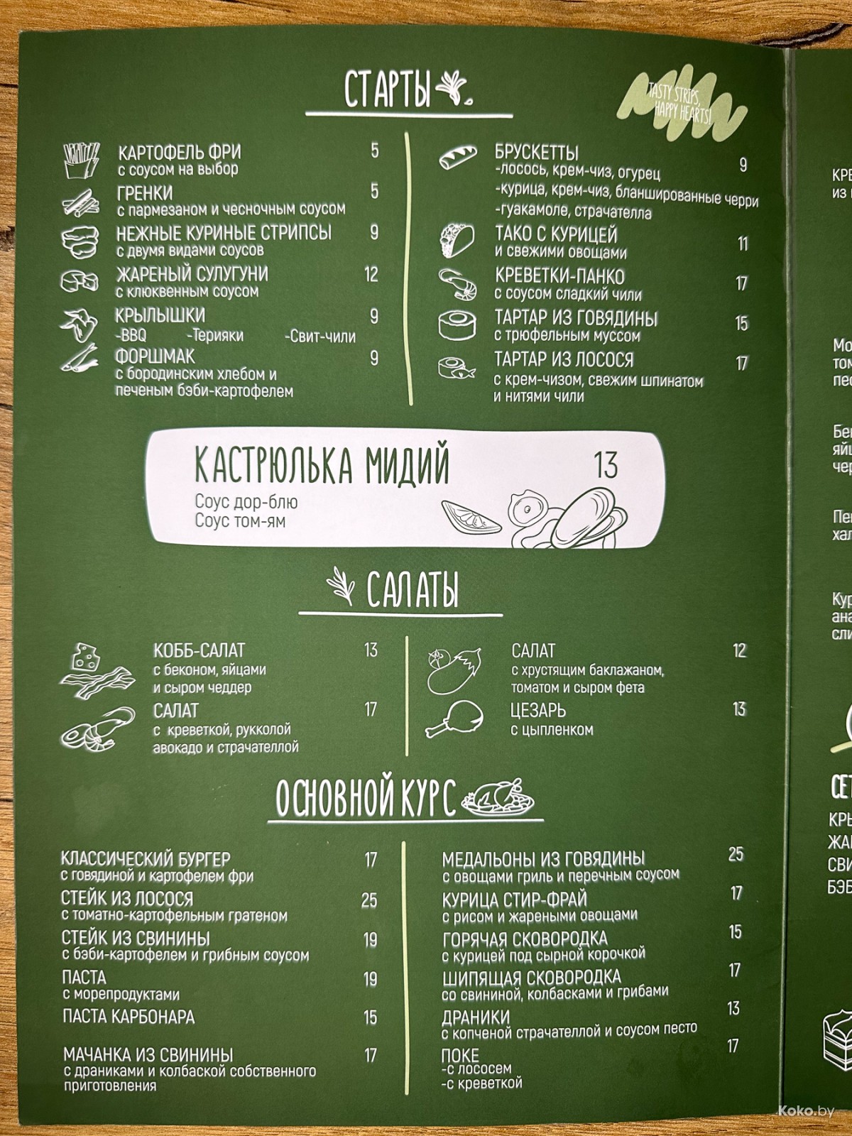 Цены ням-ням: тартар из муму за 15р, кастрюлька мидий дорблю - 13р, коктики по 13р, пицца от 13 до 19р, шипящая сковородка - 17р.