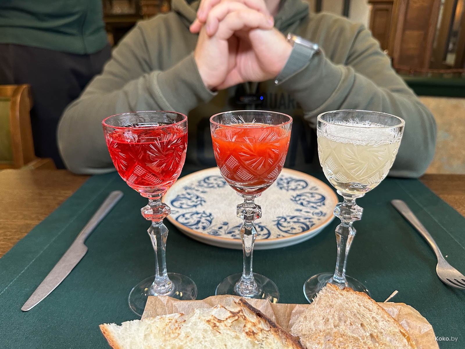 В красивые рюмки наливают: вишнёвка, малиновая, лютая хреновуха, поречка, клюква, томатно-злая, крамбабуля и крупник-укупник по 5 и 50.