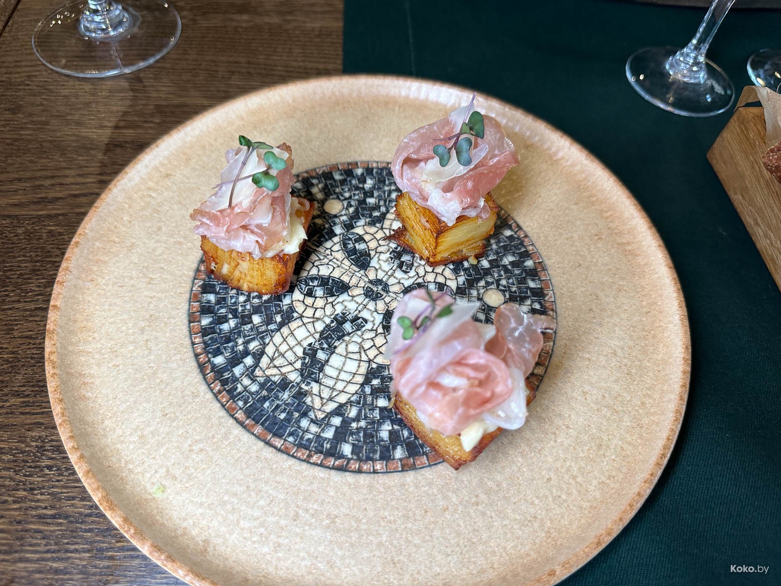 4. Сообразили на троих деревенскими картофельными тапасами, промазанными соусом из печёного чеснока с фермерским гродненским прошутто за 7р. Восхитительно, такие продукты не испортишь!