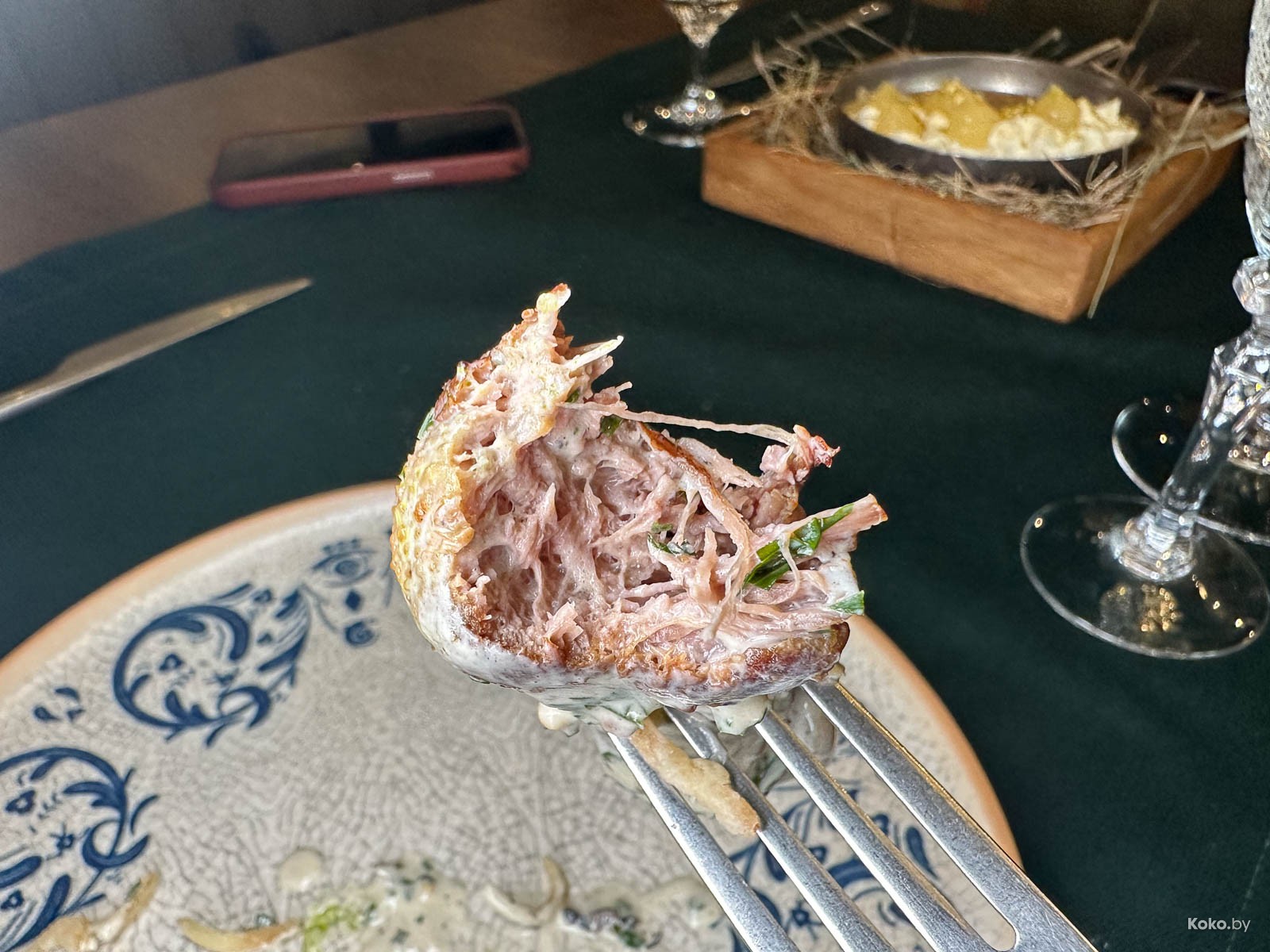 6. Белорусские ньокки с элементами речной форели витебской прописки под сырным фондю стоит 37р. Годнотище по всем критериям, но хотелось бы видеть больше картофельных колобков под рыбой.