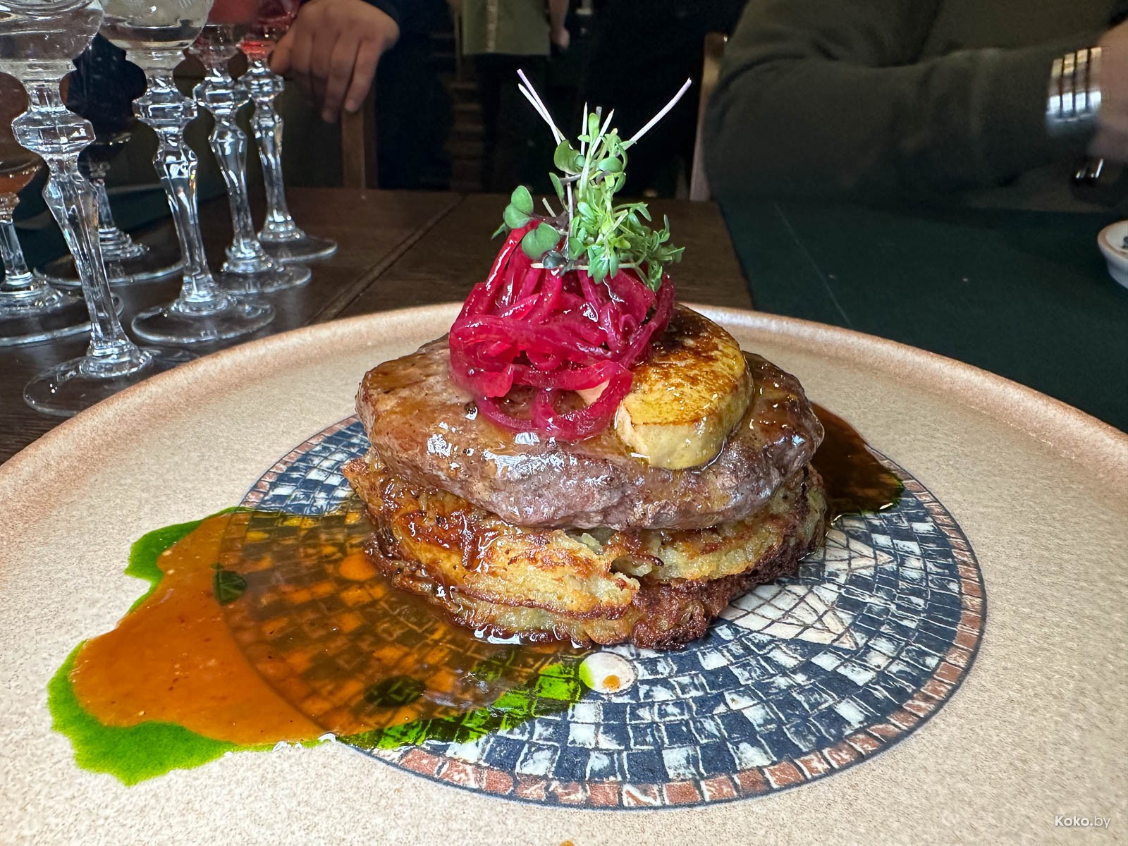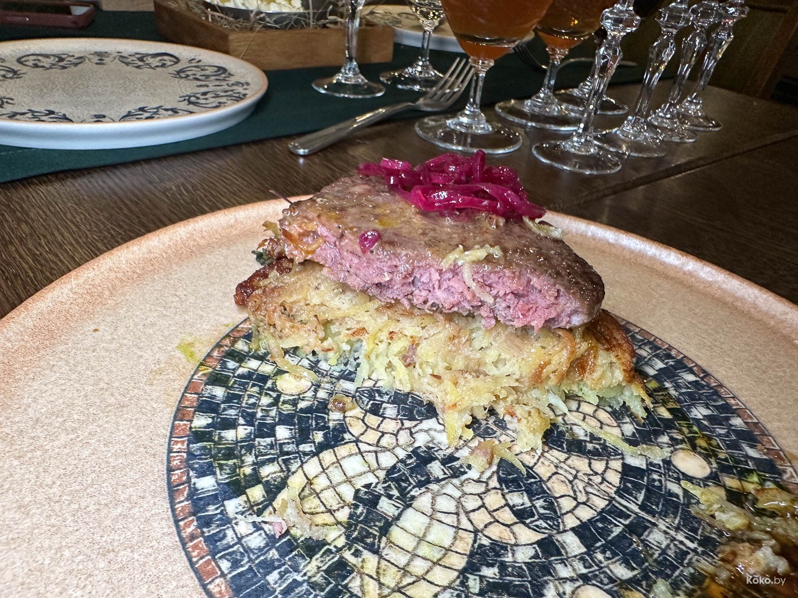7. Как заплакать за 32р. Пышно-хрустящие по картофельной структуре двойные драники с мясной котлетой в полтора пальца из одного вида говядины под котлетным соусом с печенью утки и сладким винным луком. Картошка, мясо, печень и лук - правильное сочетание.