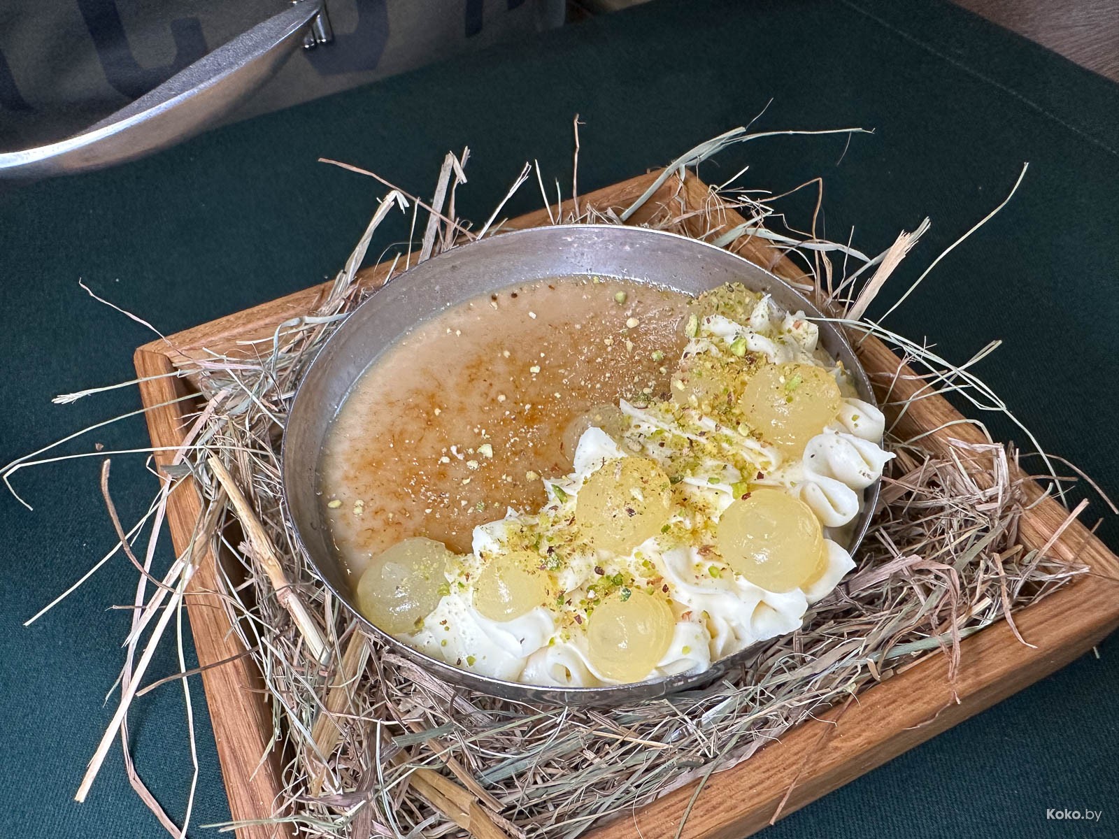 8. На десерт деревенский крем-брюле за 12р с нашими травами и взбитым туровским маскарпоне на сене. Принесли его вместе с борщом по какой-то местной традиции. Сладко и сладко, верните сырок!